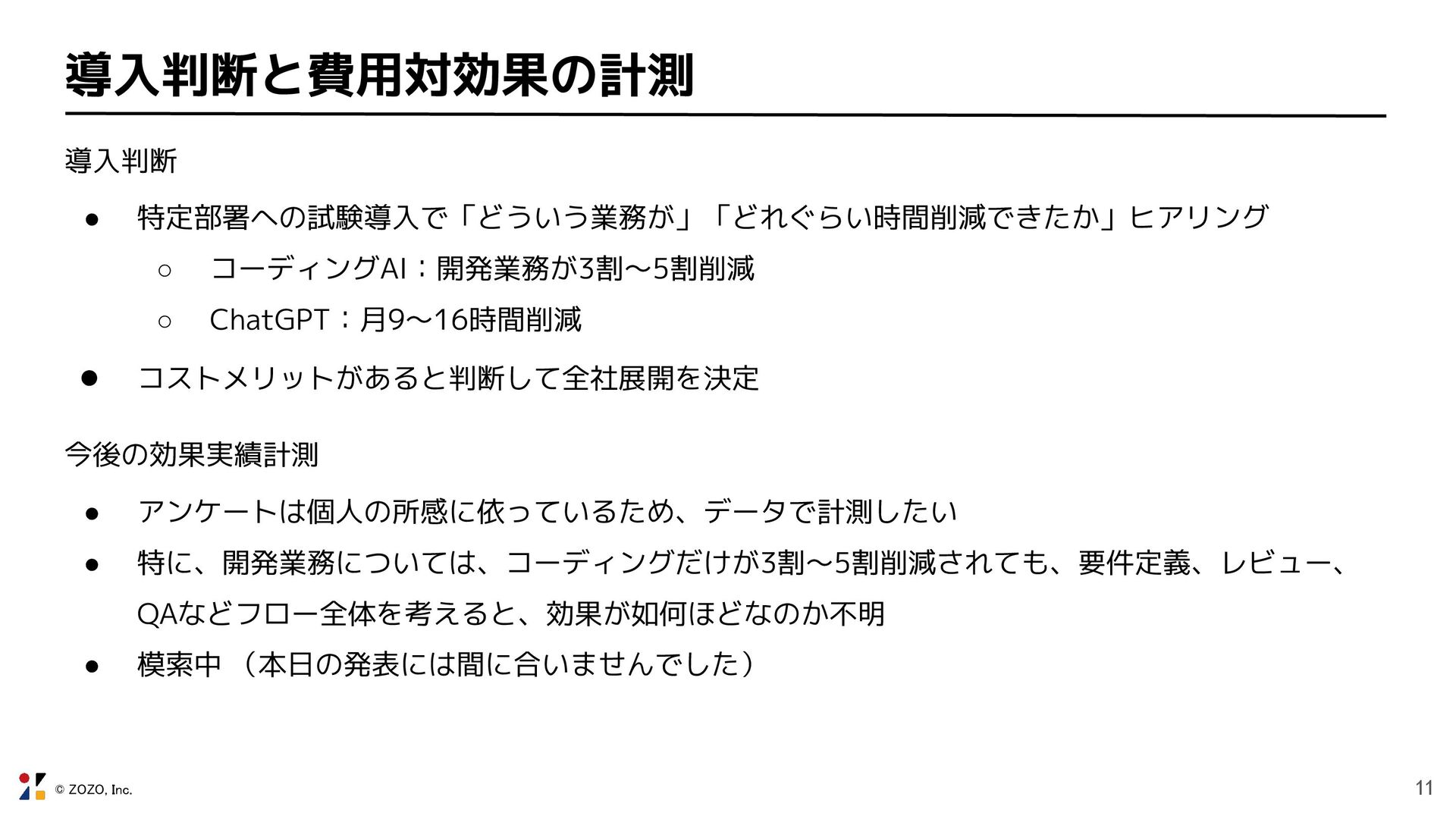 © ZOZO, Inc. 11 導入判断と費用対効果の計測 導入判断 • 特定部署への試験導入で「どういう業務が」「どれぐらい時間削減できたか」ヒアリング ◦ コーディングAI:開発業務が3割〜5割削減
