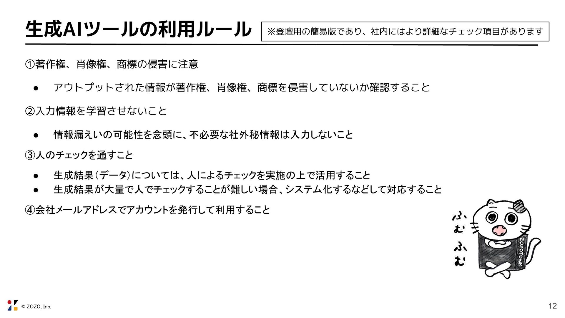 © ZOZO, Inc. 12 生成AIツールの利用ルール ①著作権、肖像権、商標の侵害に注意 • アウトプットされた情報が著作権、肖像権、商標を侵害していないか確認すること ②入力情報を学習させないこと •