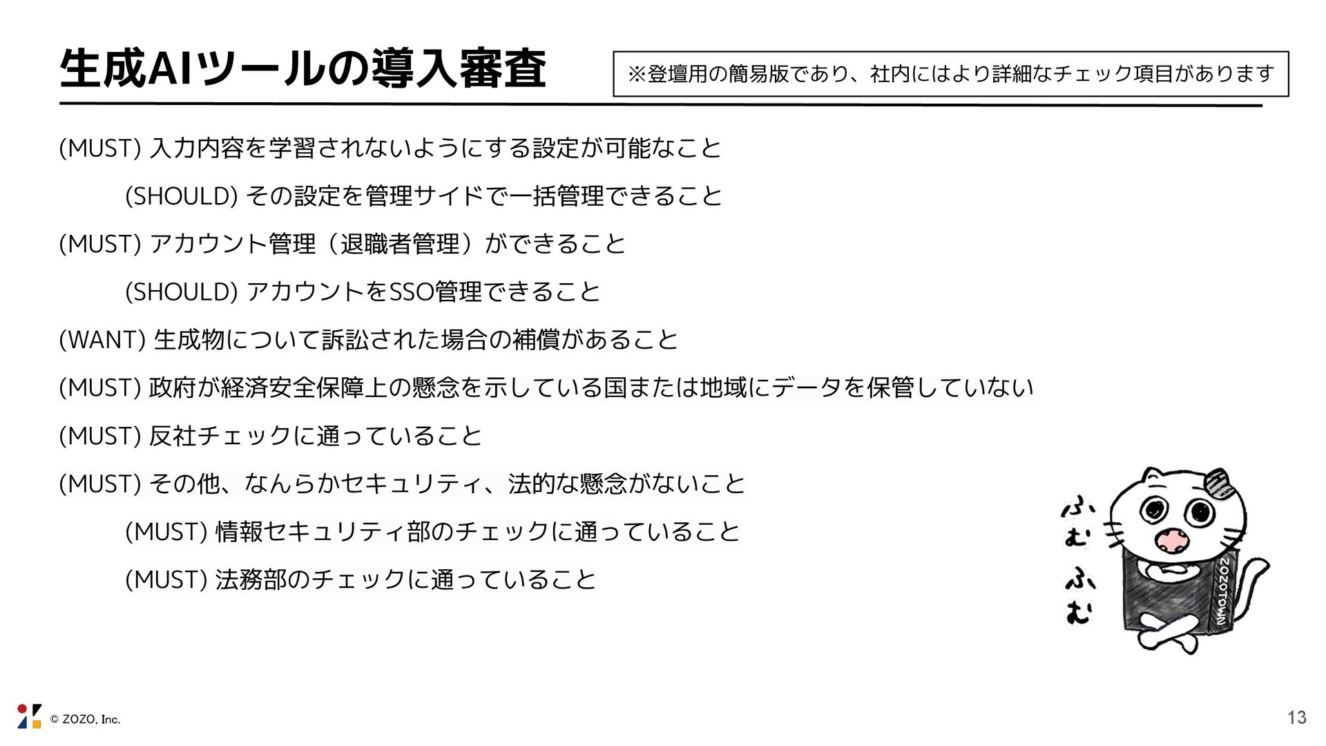 © ZOZO, Inc. 13 生成AIツールの導入審査 (MUST) 入力内容を学習されないようにする設定が可能なこと (SHOULD) その設定を管理サイドで一括管理できること (MUST)