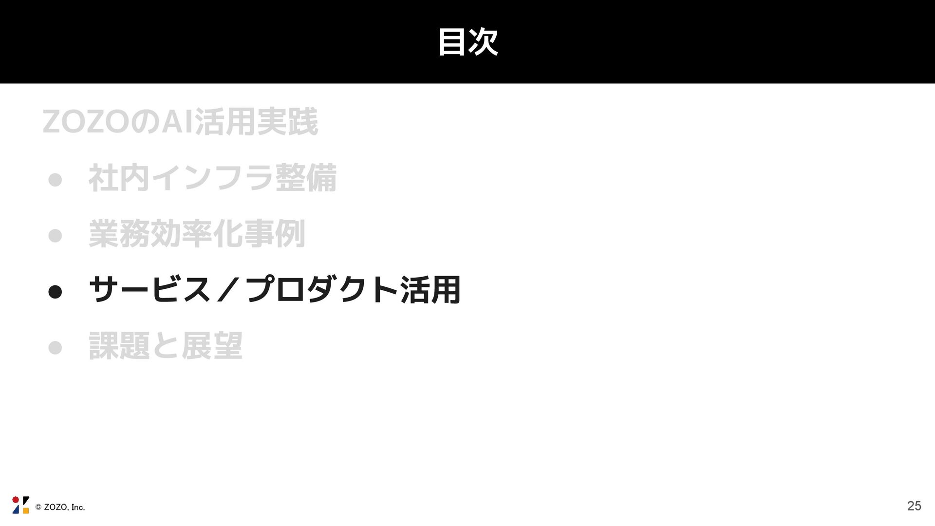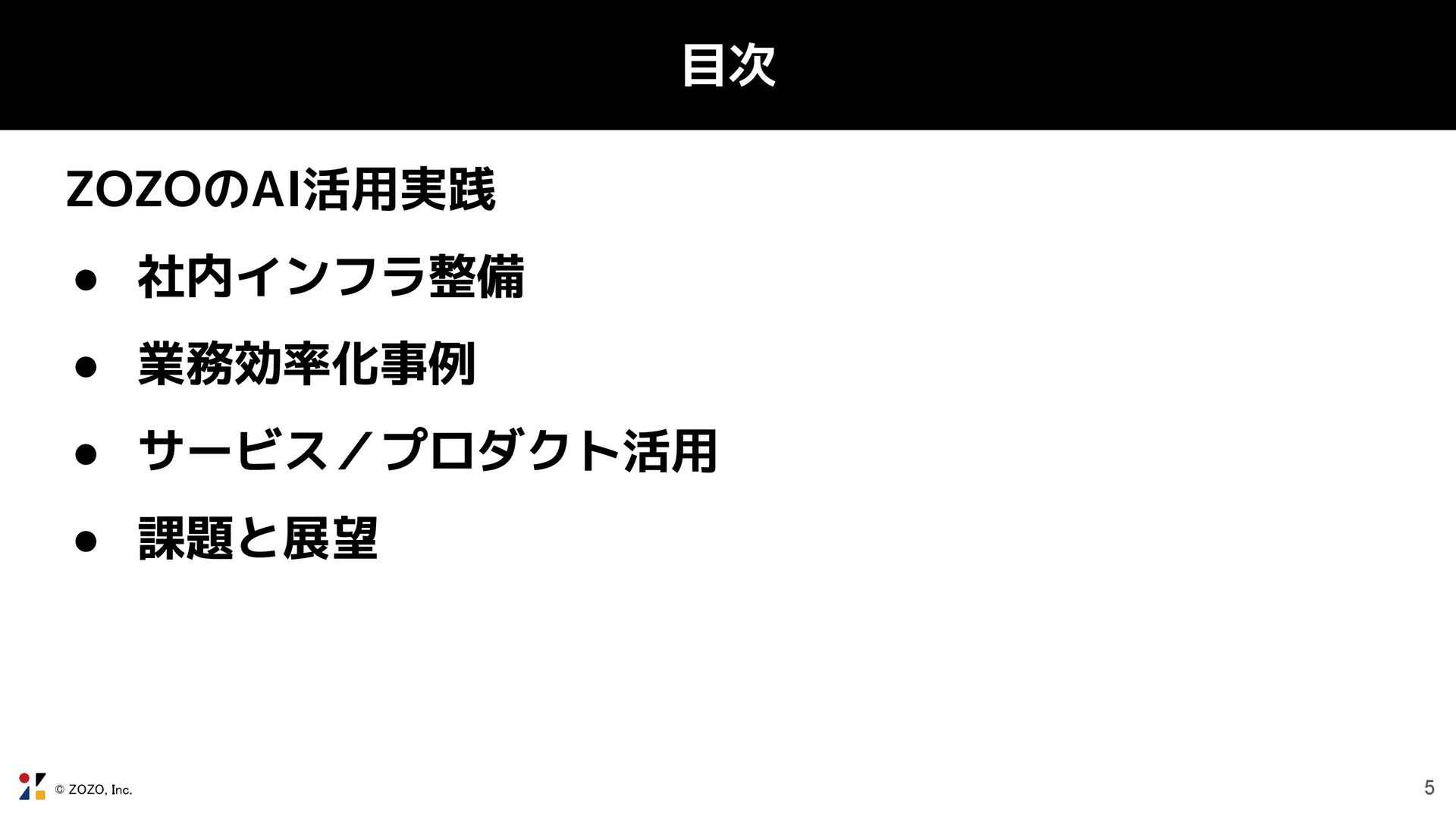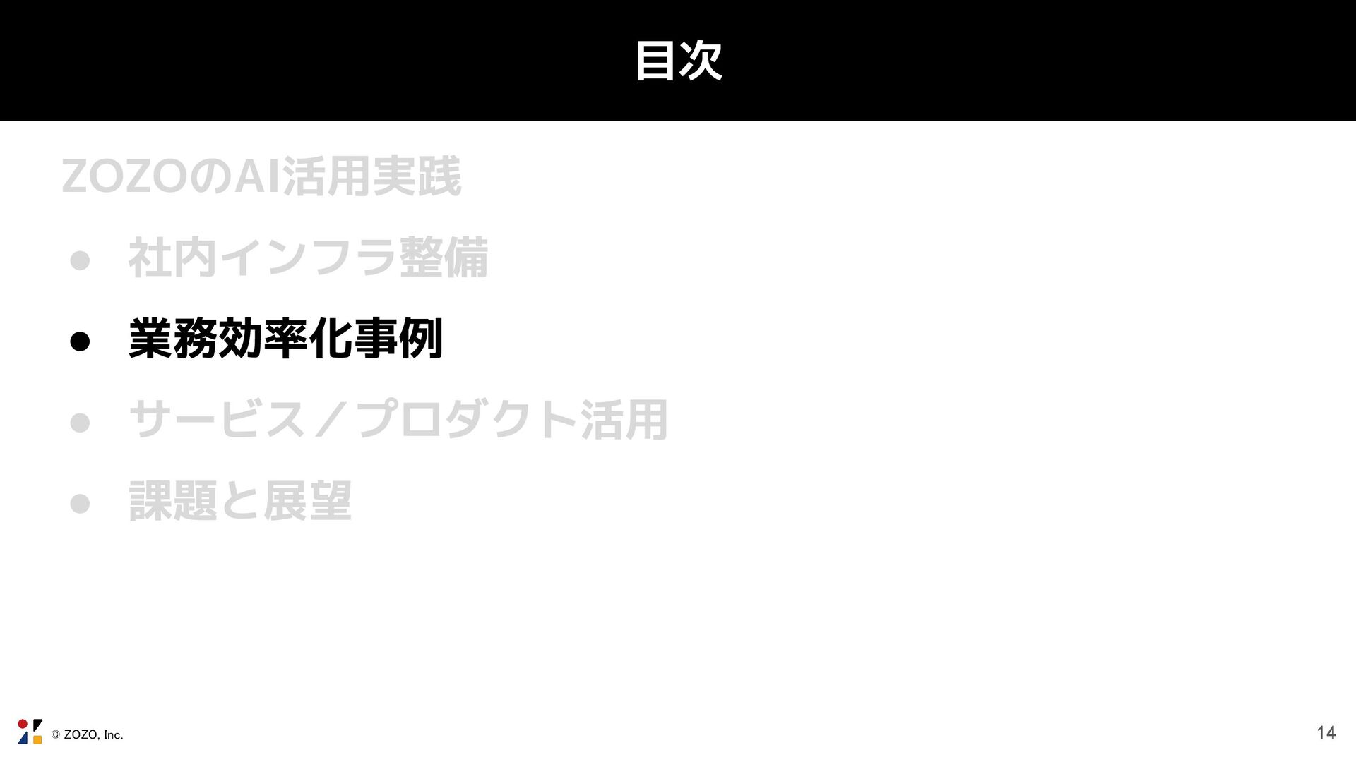 © ZOZO, Inc. 目次 ZOZOのAI活用実践 • 社内インフラ整備 • 業務効率化事例 ◦