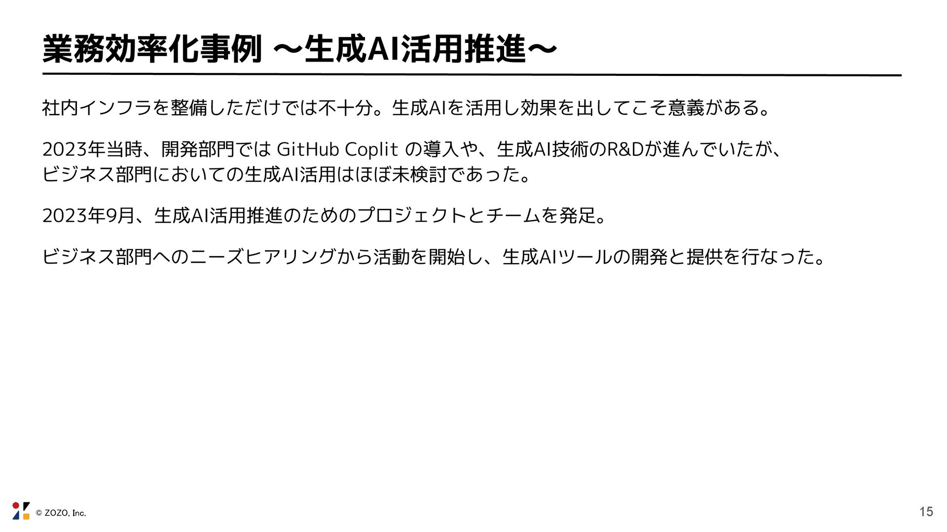 © ZOZO, Inc. 15 業務効率化事例 〜生成AI活用推進〜 社内インフラを整備しただけでは不十分。生成AIを活用し効果を出してこそ意義がある。 2023年当時、開発部門では GitHub Coplit