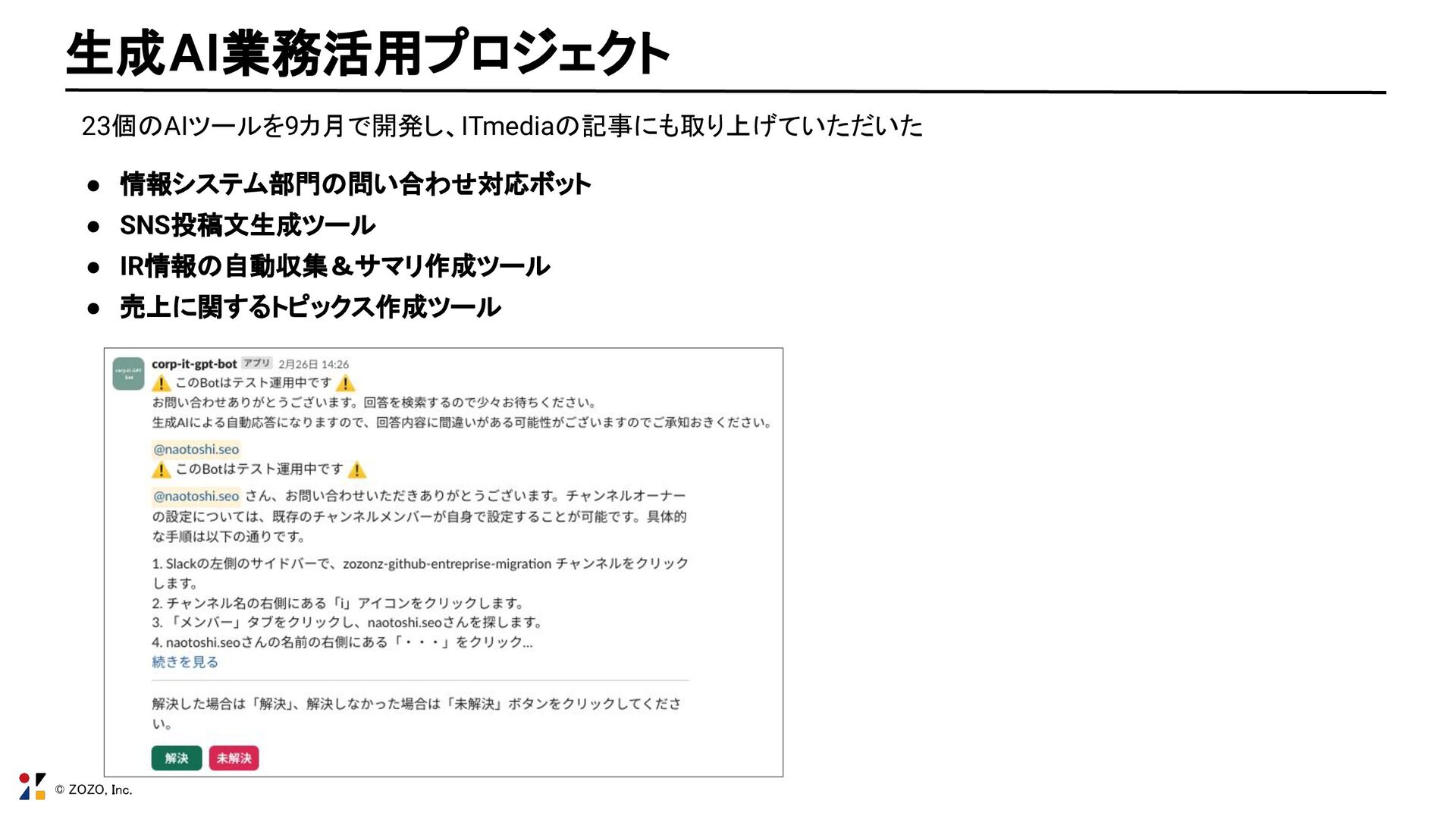 © ZOZO, Inc. • 情報システム部門の問い合わせ対応ボット • SNS投稿文生成ツール • IR情報の自動収集&サマリ作成ツール •