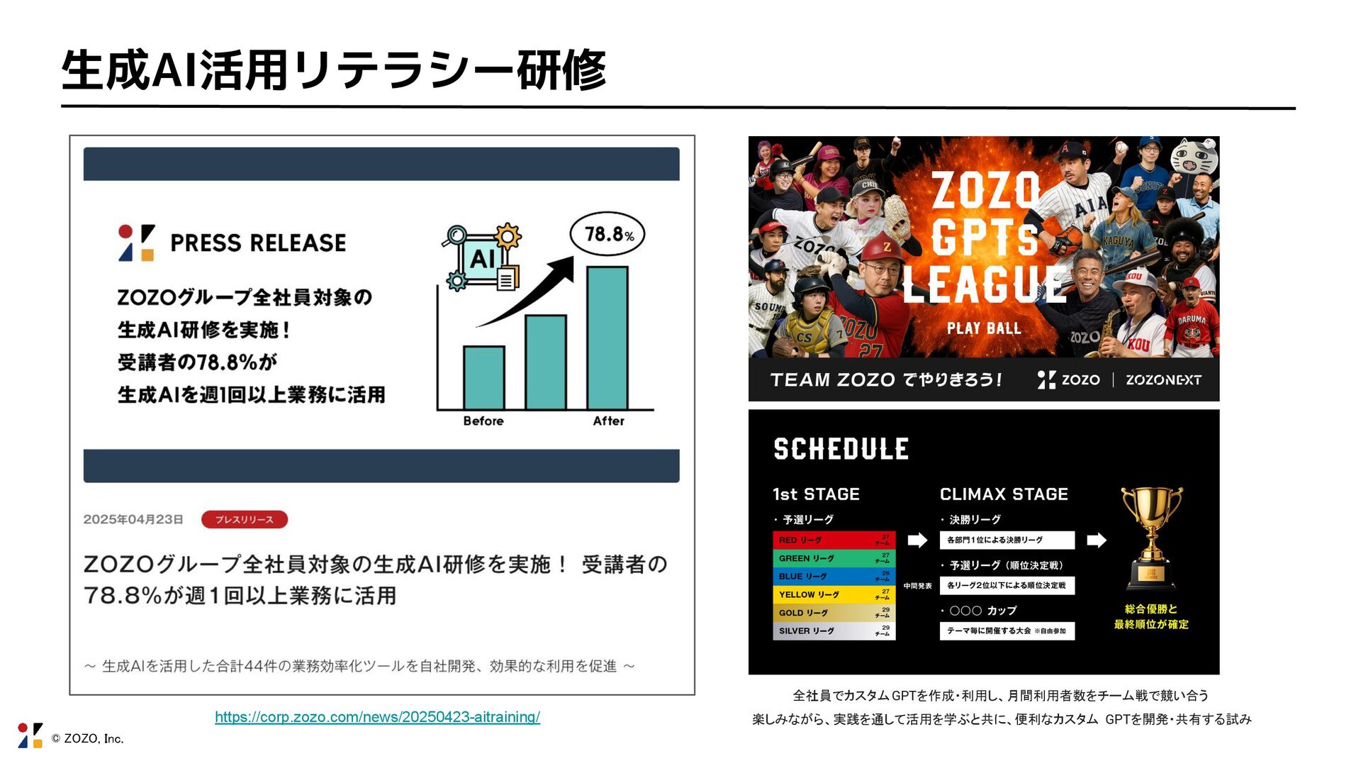 © ZOZO, Inc. 生成AI活用リテラシー研修 全社員でカスタムGPTを作成・利用し、月間利用者数をチーム戦で競い合う 楽しみながら、実践を通して活用を学ぶと共に、便利なカスタム GPTを開発・共有する試み https://corp.zozo.com/news/20250423-aitraining/