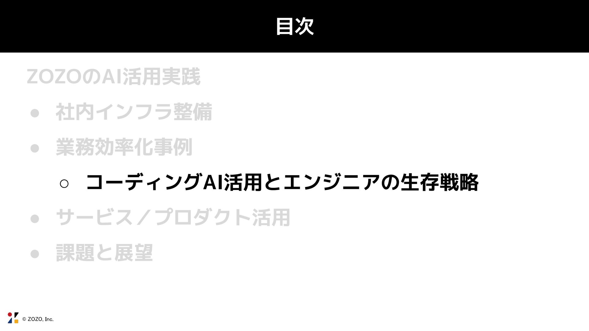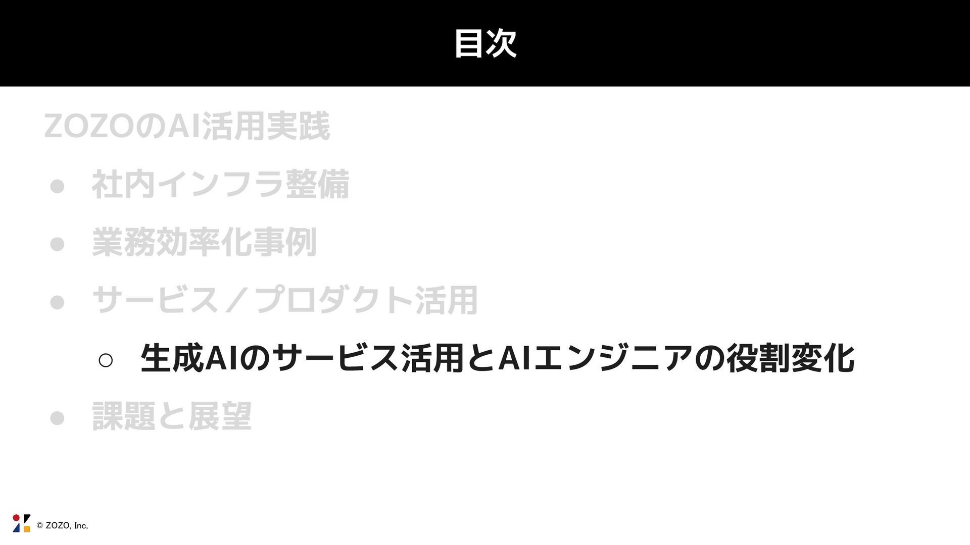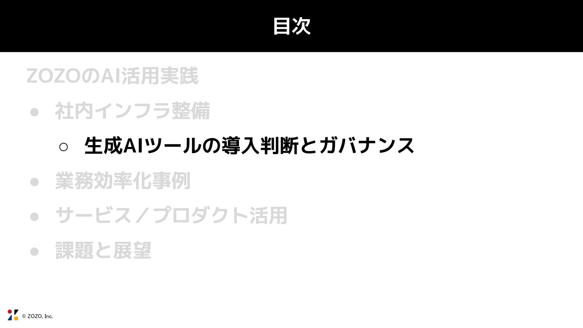 © ZOZO, Inc. 目次 ZOZOのAI活用実践 • 社内インフラ整備 ◦ 生成AIツールの導入判断とガバナンス •