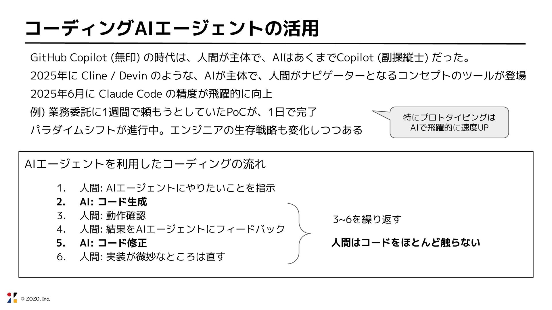 © ZOZO, Inc. コーディングAIエージェントの活用 GitHub Copilot (無印) の時代は、人間が主体で、AIはあくまでCopilot (副操縦士) だった。