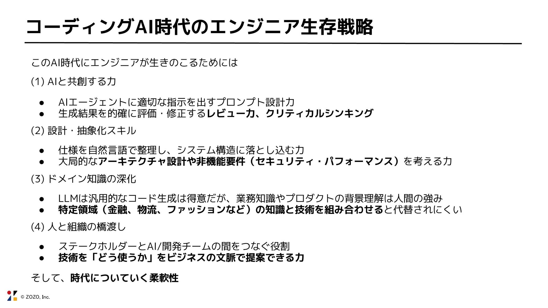 © ZOZO, Inc. コーディングAI時代のエンジニア生存戦略 このAI時代にエンジニアが生きのこるためには (1) AIと共創する力 • AIエージェントに適切な指示を出すプロンプト設計力 •