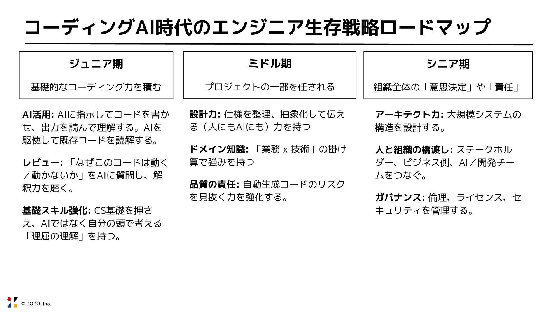© ZOZO, Inc. コーディングAI時代のエンジニア生存戦略ロードマップ AI活用: AIに指示してコードを書か せ、出力を読んで理解する。AIを 駆使して既存コードを読解する。 レビュー: 「なぜこのコードは動く
