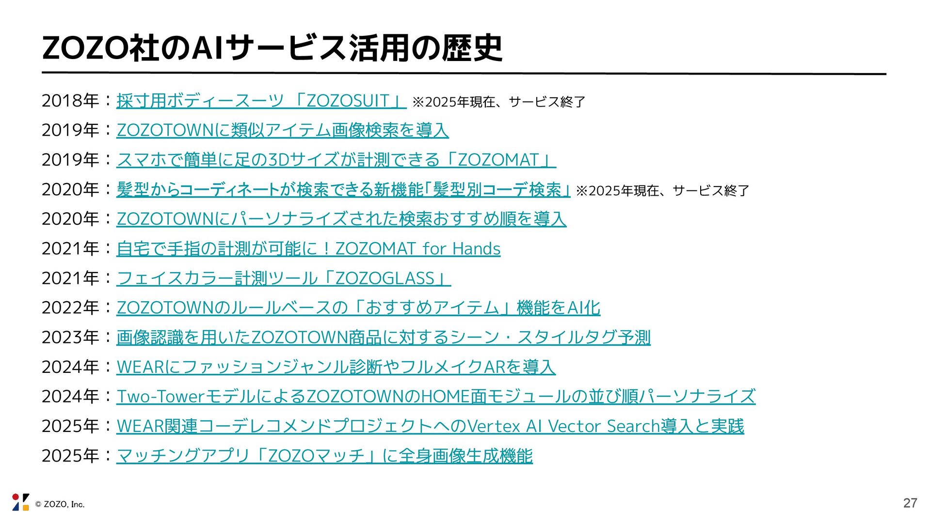 2020年:髪型からコーディネートが検索できる新機能「髪型別コーデ検索」 ※2025年現在、サービス終了 2020年:ZOZOTOWNにパーソナライズされた検索おすすめ順を導入 2021年:自宅で手指の計測が可能に!ZOZOMAT for Hands 2021年:フェイスカラー計測ツール「ZOZOGLASS」 2022年:ZOZOTOWNのルールベースの「おすすめアイテム」機能をAI化 2023年:画像認識を用いたZOZOTOWN商品に対するシーン・スタイルタグ予測 2024年:WEARにファッションジャンル診断やフルメイクARを導入 2024年:Two-TowerモデルによるZOZOTOWNのHOME面モジュールの並び順パーソナライズ 2025年:WEAR関連コーデレコメンドプロジェクトへのVertex AI Vector Search導入と実践 2025年:マッチングアプリ「ZOZOマッチ」に全身画像生成機能