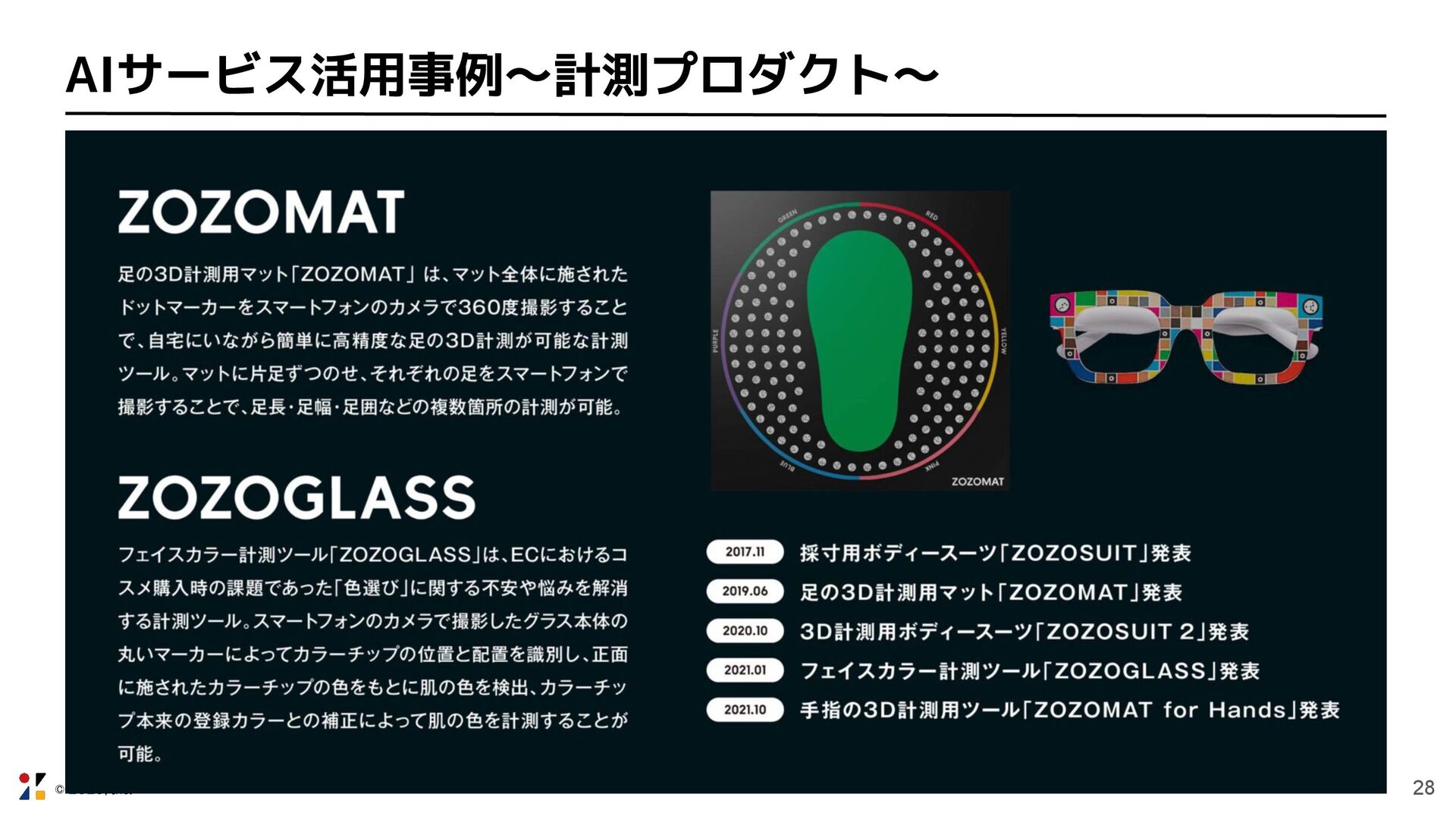 © ZOZO, Inc. 27 ZOZO社のAIサービス活用の歴史 2018年:採寸用ボディースーツ 「ZOZOSUIT」 ※2025年現在、サービス終了 2019年:ZOZOTOWNに類似アイテム画像検索を導入 2019年:スマホで簡単に足の3Dサイズが計測できる「ZOZOMAT」