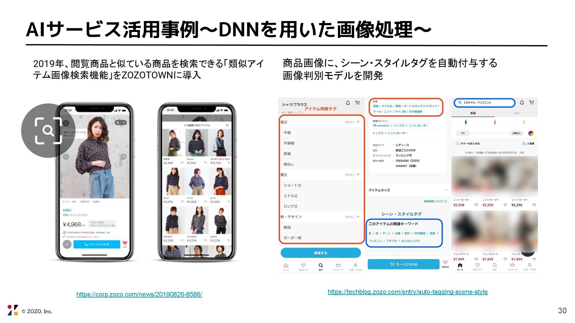 © ZOZO, Inc. 30 AIサービス活用事例〜DNNを用いた画像処理〜 2019年、閲覧商品と似ている商品を検索できる「類似アイ テム画像検索機能」をZOZOTOWNに導入 https://corp.zozo.com/news/20190826-8586/ https://techblog.zozo.com/entry/auto-tagging-scene-style 商品画像に、シーン・スタイルタグを自動付与する