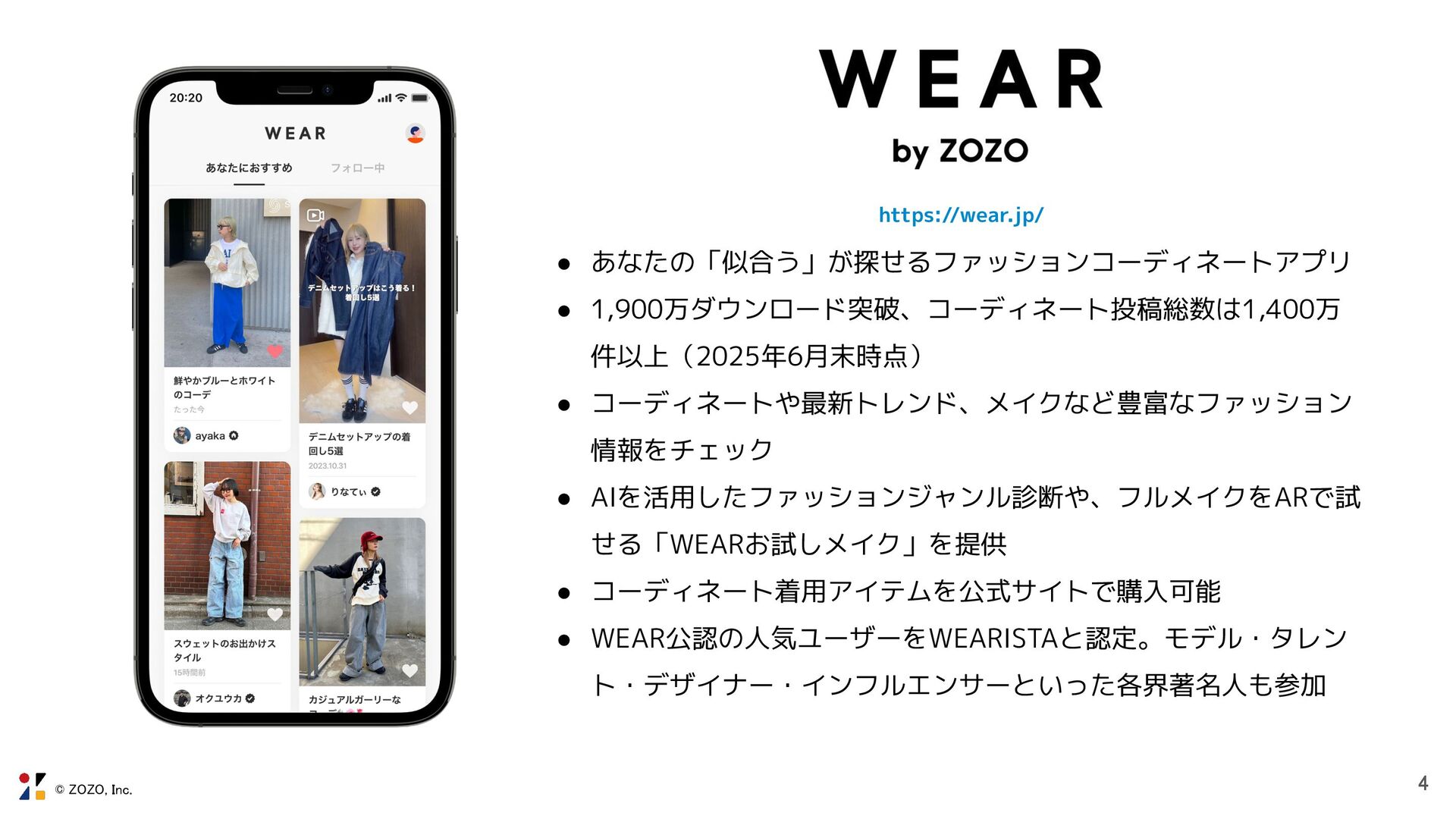© ZOZO, Inc. https://wear.jp/ 4 • あなたの「似合う」が探せるファッションコーディネートアプリ • 1,900万ダウンロード突破、コーディネート投稿総数は1,400万 件以上(2025年6月末時点)