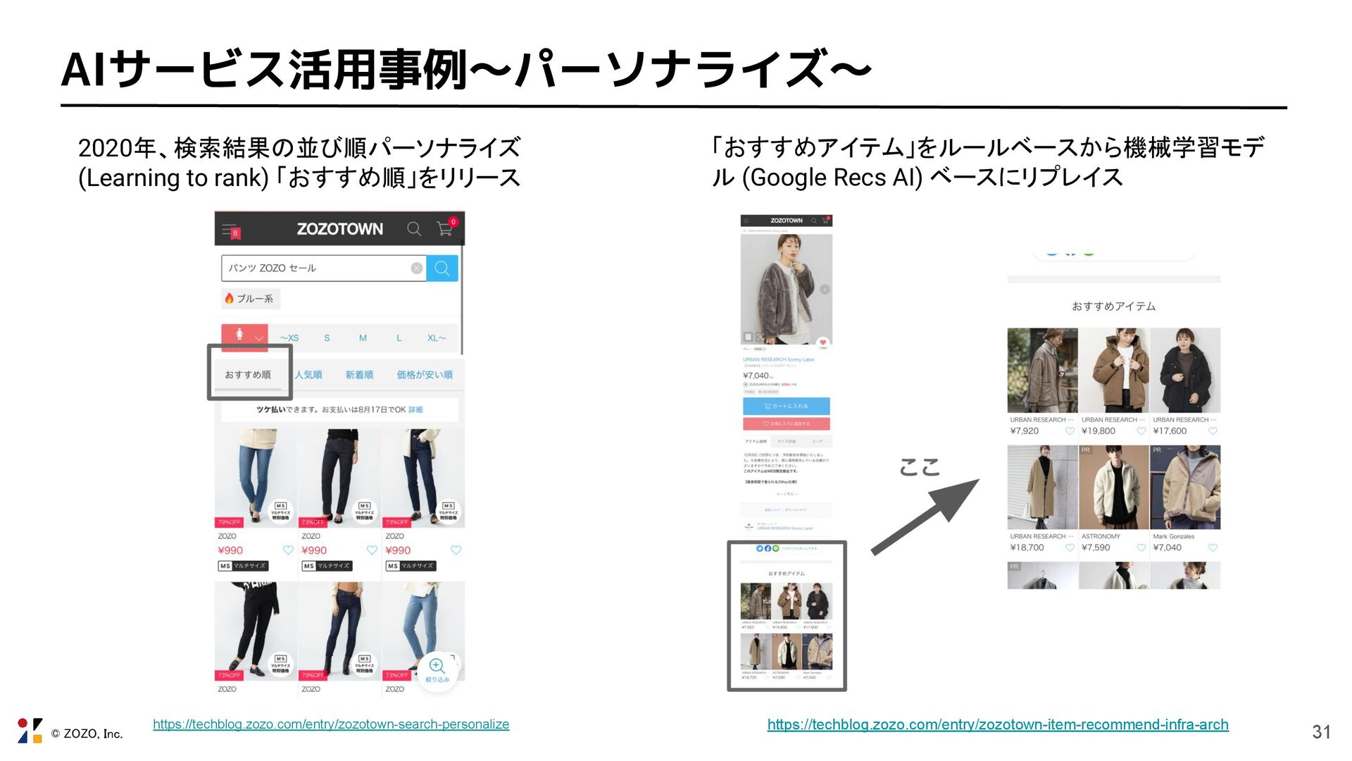 © ZOZO, Inc. 31 AIサービス活用事例〜パーソナライズ〜 2020年、検索結果の並び順パーソナライズ (Learning to rank) 「おすすめ順」をリリース