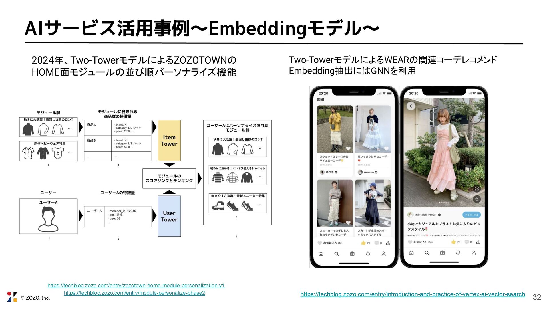 © ZOZO, Inc. 32 AIサービス活用事例〜Embeddingモデル〜 2024年、Two-TowerモデルによるZOZOTOWNの HOME面モジュールの並び順パーソナライズ機能 Two-TowerモデルによるWEARの関連コーデレコメンド Embedding抽出にはGNNを利用 https://techblog.zozo.com/entry/introduction-and-practice-of-vertex-ai-vector-search