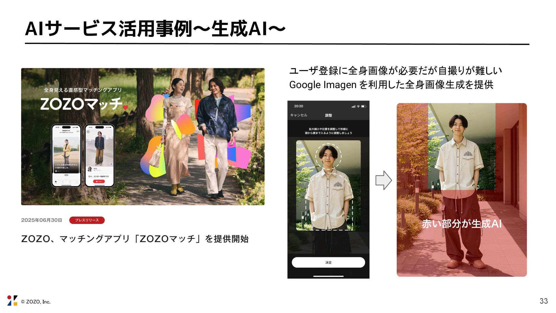 © ZOZO, Inc. 33 AIサービス活用事例〜生成AI〜 ユーザ登録に全身画像が必要だが自撮りが難しい Google Imagen を利用した全身画像生成を提供
