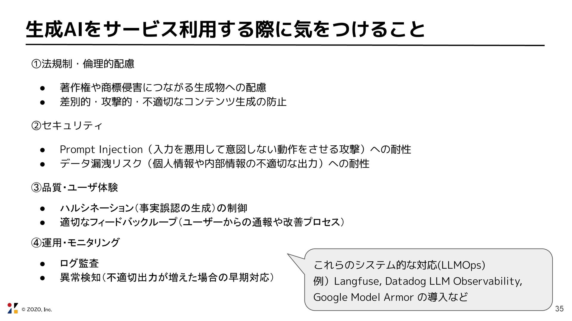 ②セキュリティ • Prompt Injection(入力を悪用して意図しない動作をさせる攻撃)への耐性 • データ漏洩リスク(個人情報や内部情報の不適切な出力)への耐性 ③品質・ユーザ体験 • ハルシネーション(事実誤認の生成)の制御 • 適切なフィードバックループ(ユーザーからの通報や改善プロセス) ④運用・モニタリング • ログ監査 • 異常検知(不適切出力が増えた場合の早期対応) これらのシステム的な対応(LLMOps)が必要 例)Langfuse, Datadog LLM Observability, Google Model Armor の導入など