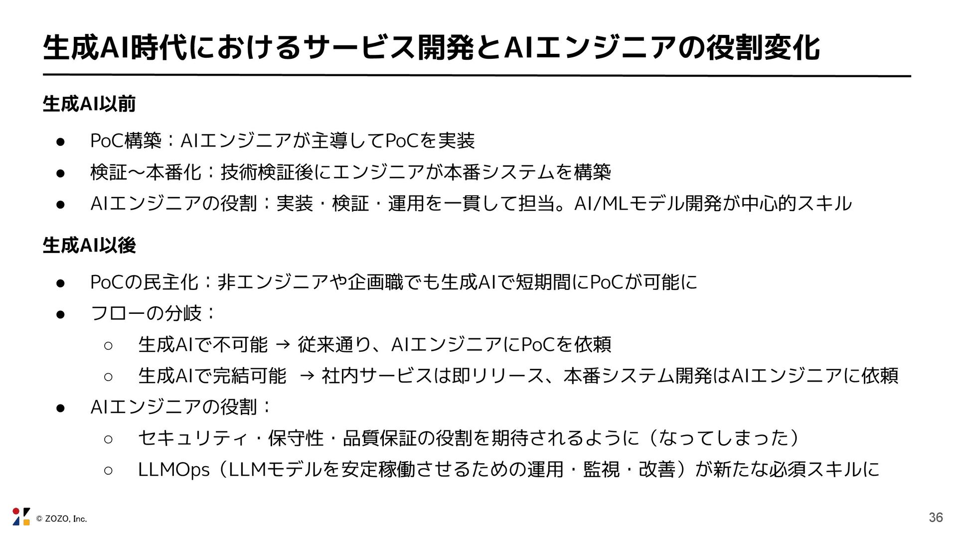 • AIエンジニアの役割:実装・検証・運用を一貫して担当。AI/MLモデル開発が中心的スキル 生成AI以後 • PoCの民主化:非エンジニアや企画職でも生成AIで短期間にPoCが可能に • フローの分岐: ◦ 生成AIで不可能 → 従来通り、AIエンジニアにPoCを依頼 ◦ 生成AIで完結可能 → 社内サービスは即リリース、本番システム開発はAIエンジニアに依頼 • AIエンジニアの役割: ◦ セキュリティ・保守性・品質保証の役割を期待されるように(なってしまった) ◦ LLMOps(LLMモデルを安定稼働させるための運用・監視・改善)が新たな必須スキルに
