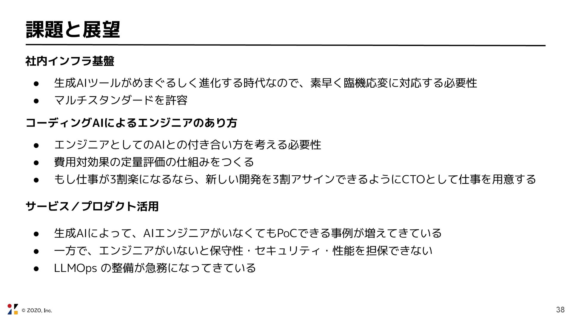 © ZOZO, Inc. 38 課題と展望 社内インフラ基盤 • 生成AIツールがめまぐるしく進化する時代なので、素早く臨機応変に対応する必要性 • マルチスタンダードを許容