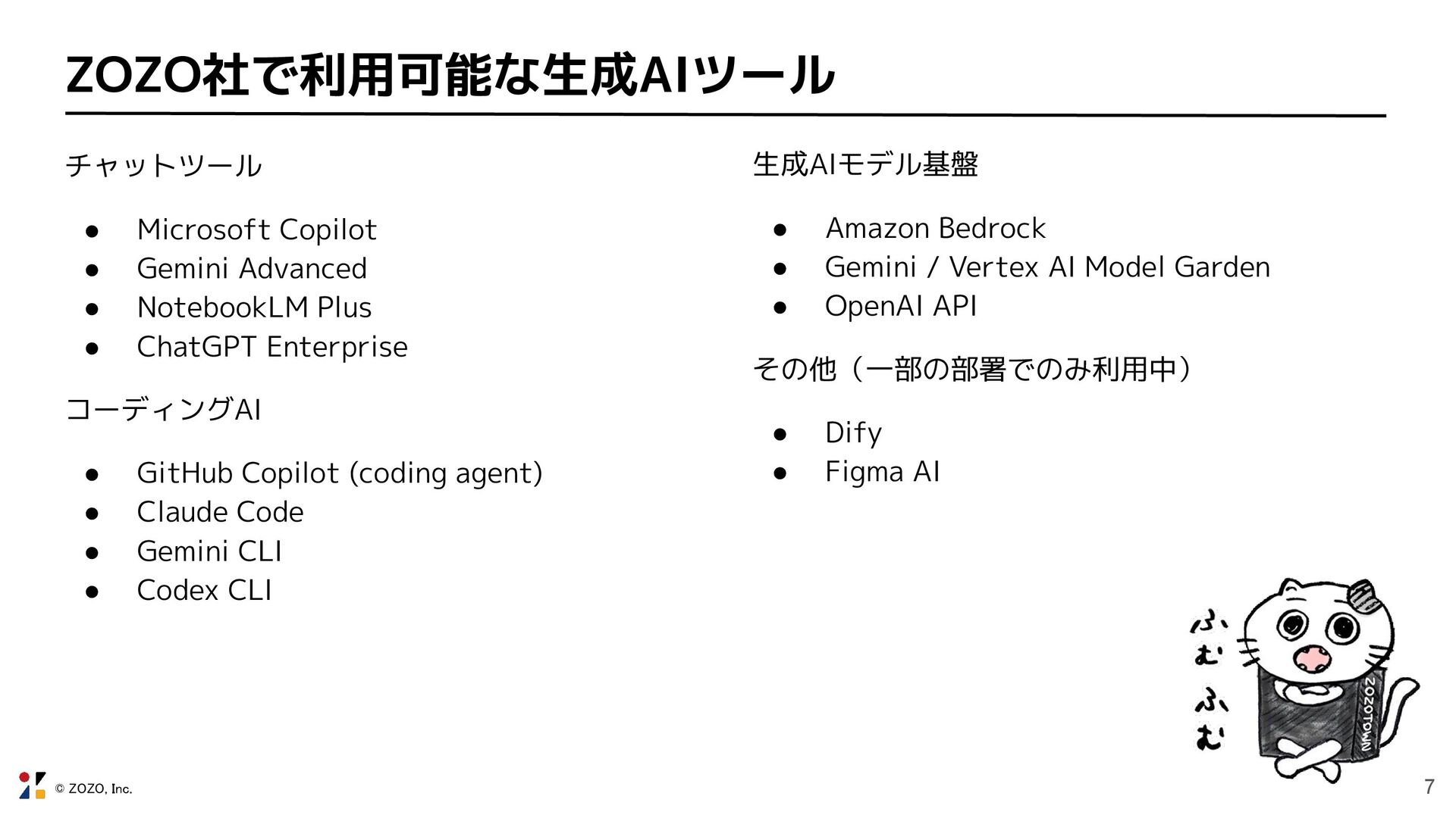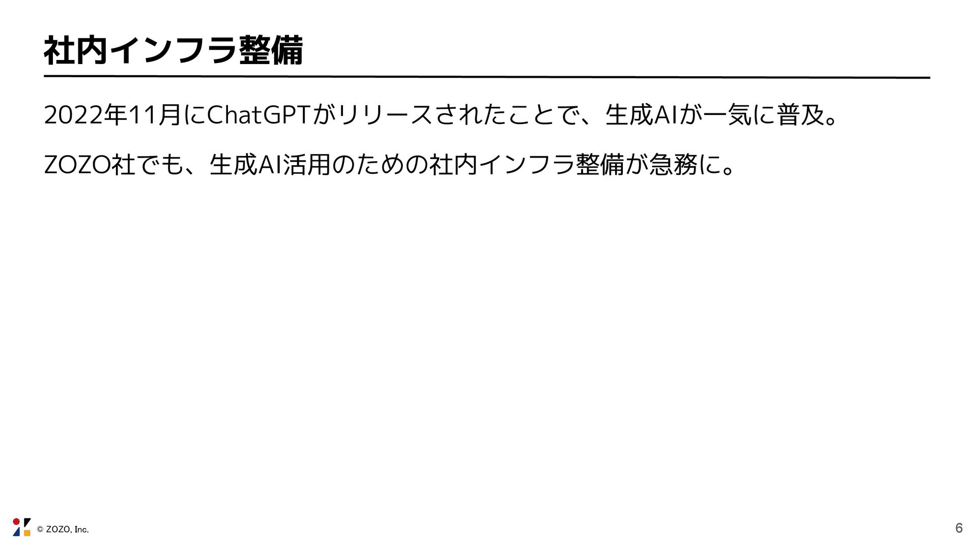 © ZOZO, Inc. 6 社内インフラ整備 2022年11月にChatGPTがリリースされたことで、生成AIが一気に普及。 ZOZO社でも、生成AI活用のための社内インフラ整備が急務に。