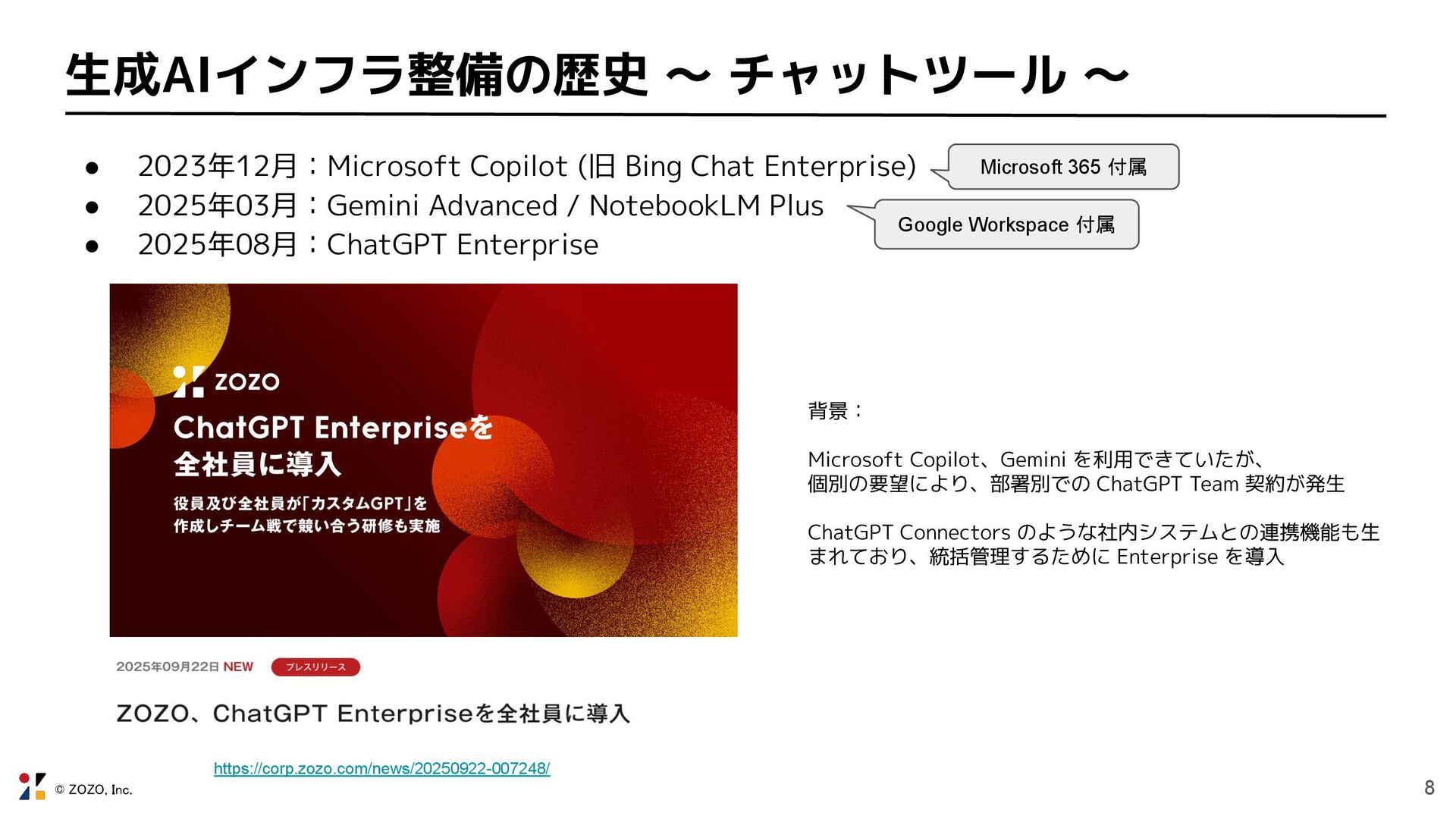 Copilot (旧 Bing Chat Enterprise) • 2025年03月:Gemini Advanced / NotebookLM Plus • 2025年08月:ChatGPT Enterprise Microsoft 365 付属 Google Workspace 付属 背景: Microsoft Copilot、Gemini を利用できていたが、 個別の要望により、部署別での ChatGPT Team 契約が発生 ChatGPT Connectors のような社内システムとの連携機能も生 まれており、統括管理するために Enterprise を導入 https://corp.zozo.com/news/20250922-007248/