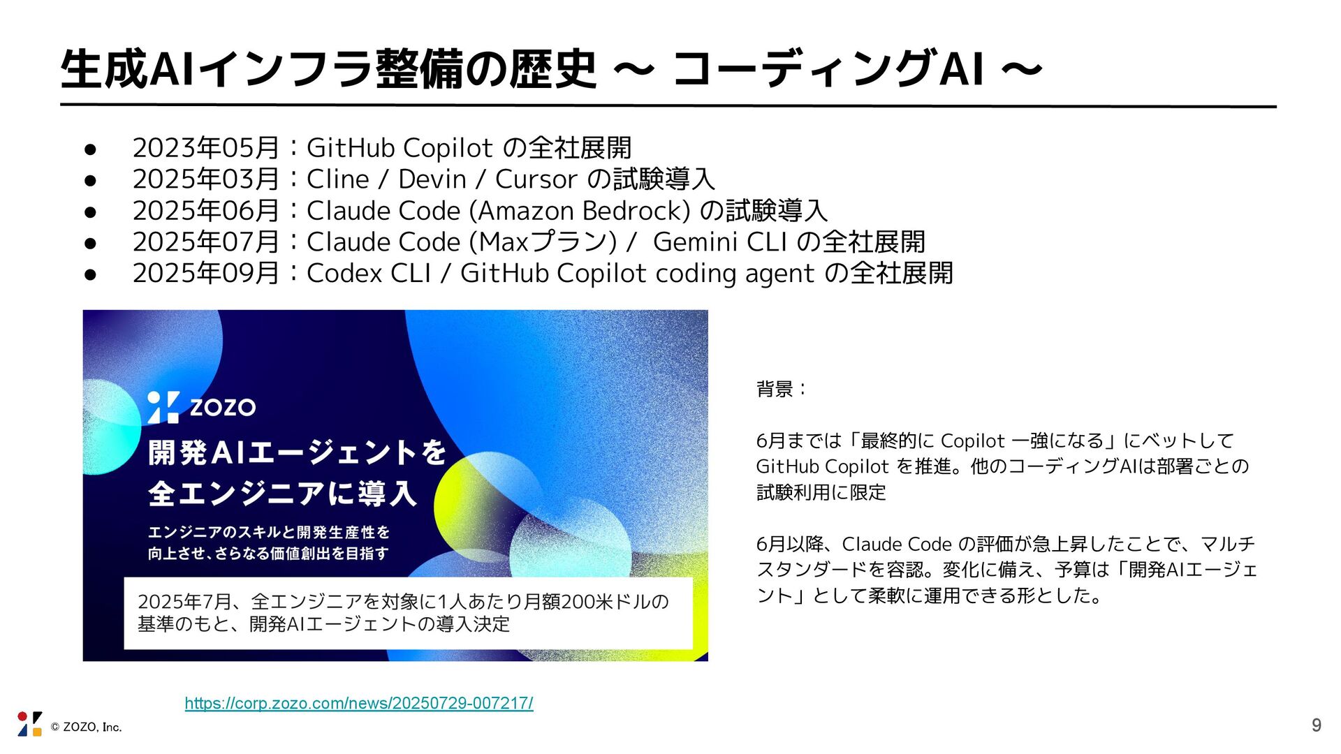 Copilot の全社展開 • 2025年03月:Cline / Devin / Cursor の試験導入が進む • 2025年06月:Claude Code (Amazon Bedrock) の試験導入が進む • 2025年07月:Claude Code (Maxプラン) / Gemini CLI の全社展開 • 2025年09月:Codex CLI / GitHub Copilot coding agent の全社展開 背景: 6月までは「最終的に Copilot 一強になる」にベットして GitHub Copilot を推進。他のコーディングAIは部署ごとの 試験利用に限定 6月以降、Claude Code の評価が急上昇したことで、マルチ スタンダードを容認。変化に備え、予算は「開発AIエージェ ント」として柔軟に運用できる形とした。 2025年7月、全エンジニアを対象に1人あたり月額200米ドルの 基準のもと、開発AIエージェントの導入決定 https://corp.zozo.com/news/20250729-007217/