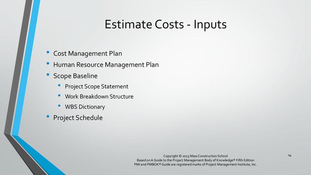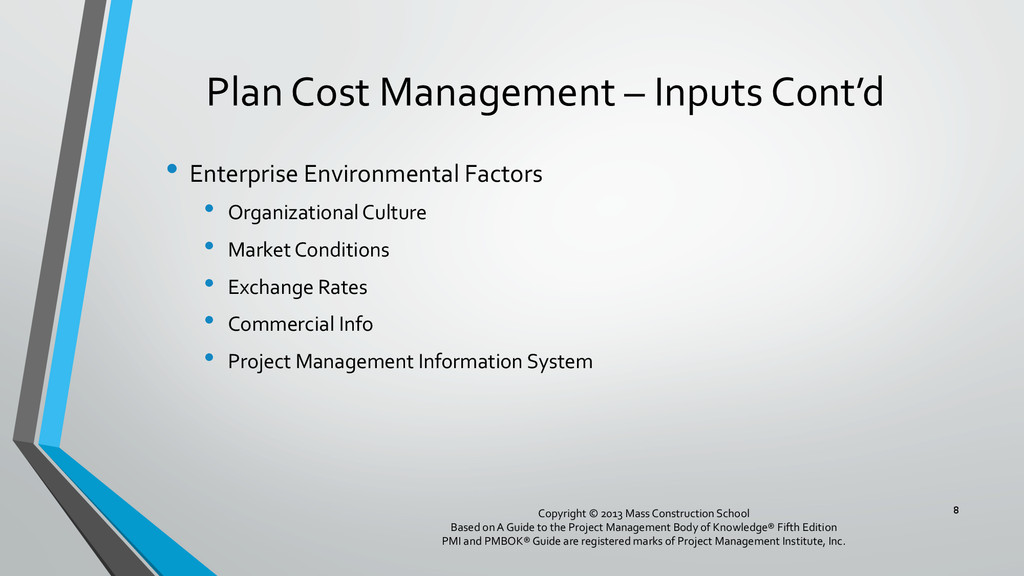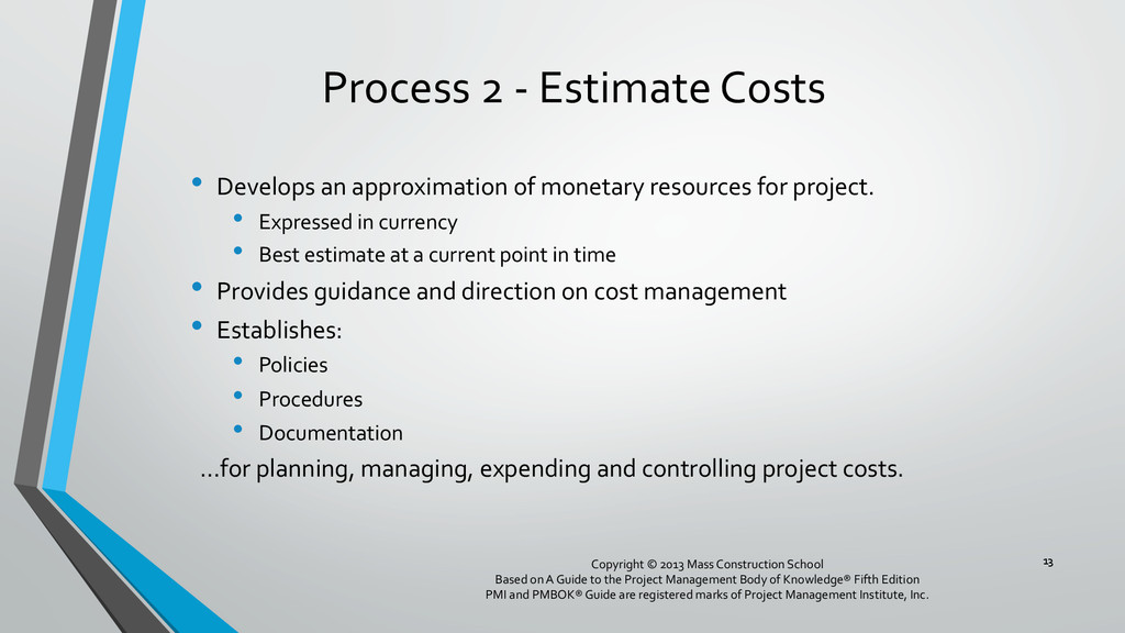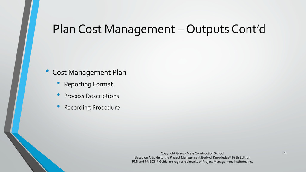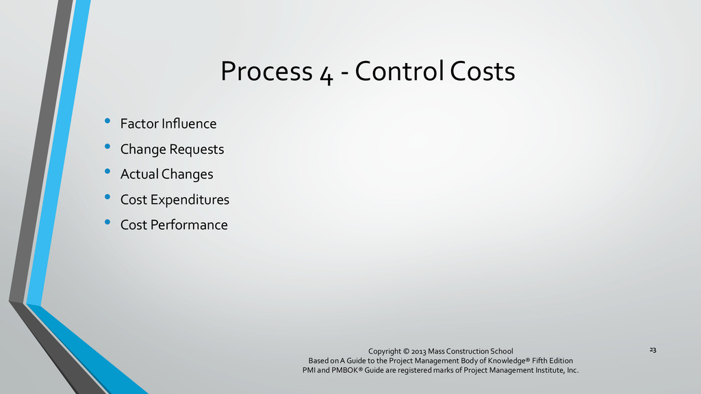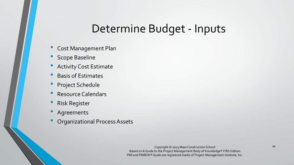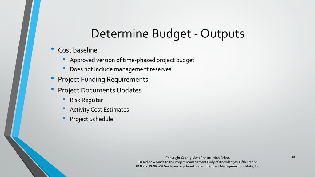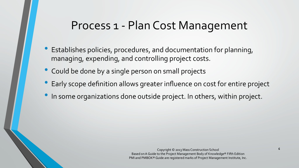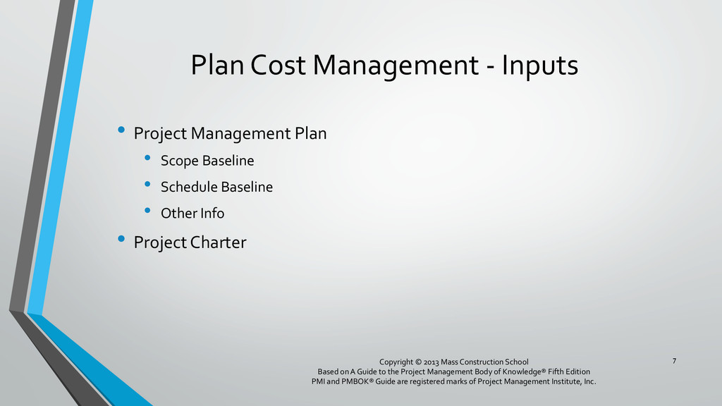 procedures, and documentation for planning, managing, expending, and controlling project costs. • Could be done by a single person on small projects • Early scope definition allows greater influence on cost for entire project • In some organizations done outside project. In others, within project. 6 Copyright © 2013 Mass Construction School Based on A Guide to the Project Management Body of Knowledge® Fifth Edition PMI and PMBOK® Guide are registered marks of Project Management Institute, Inc.
