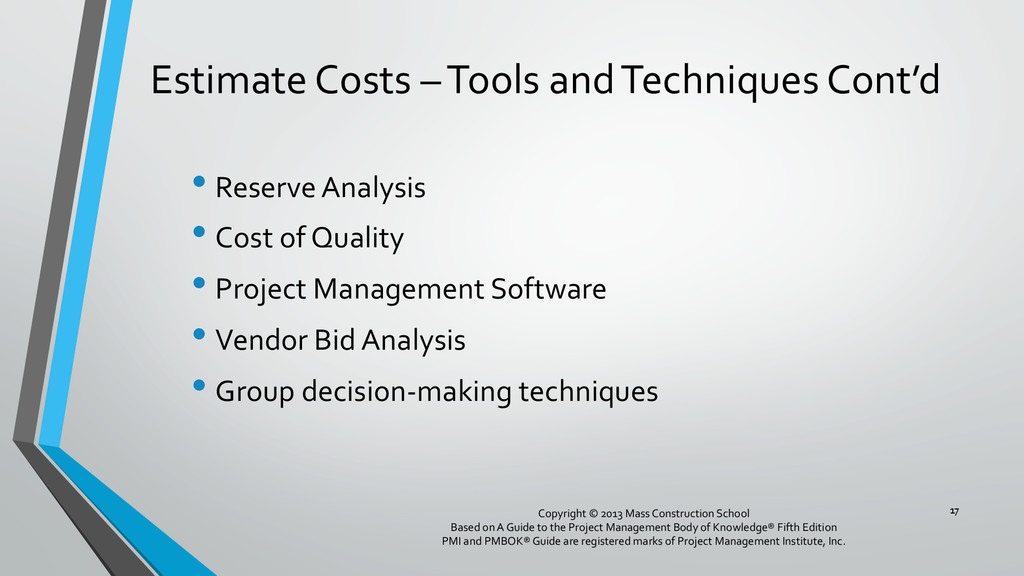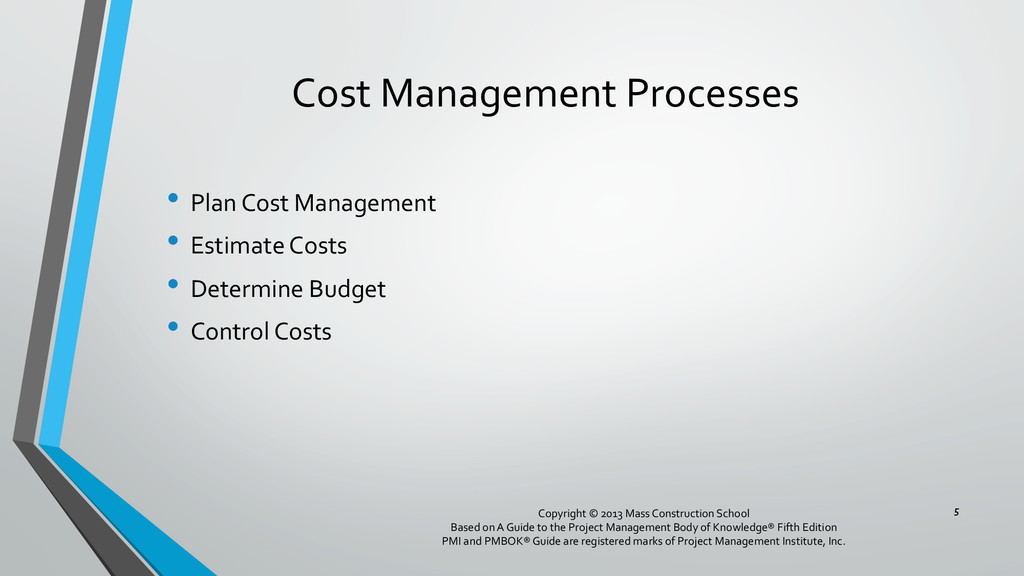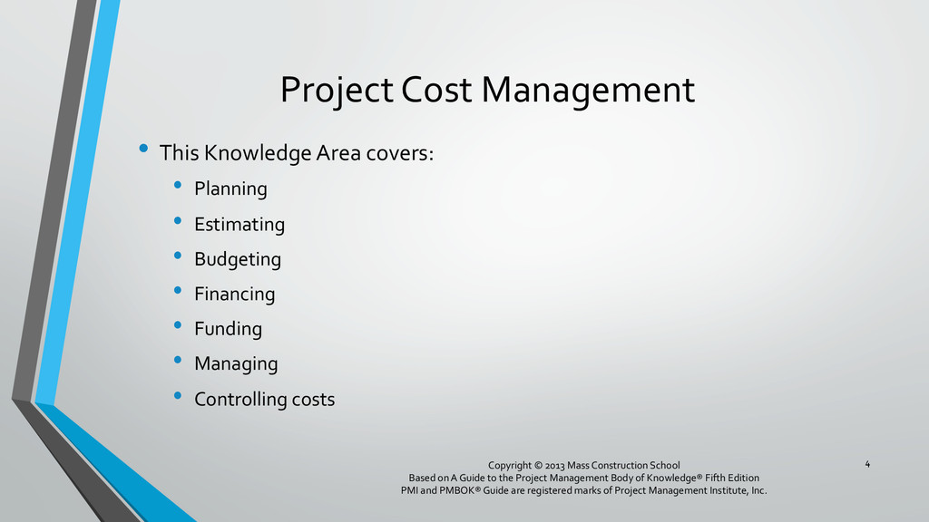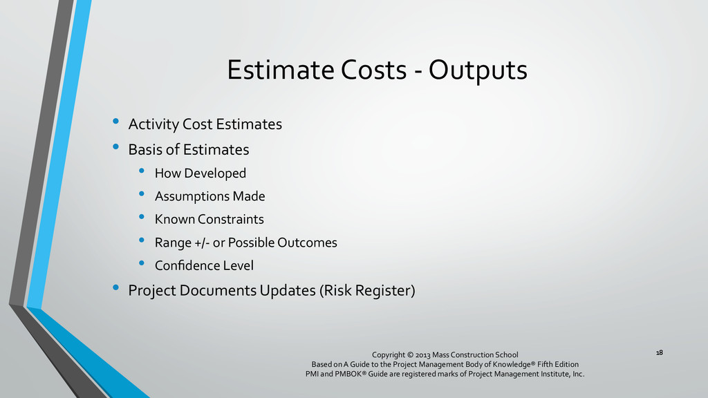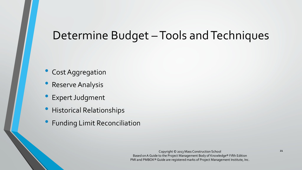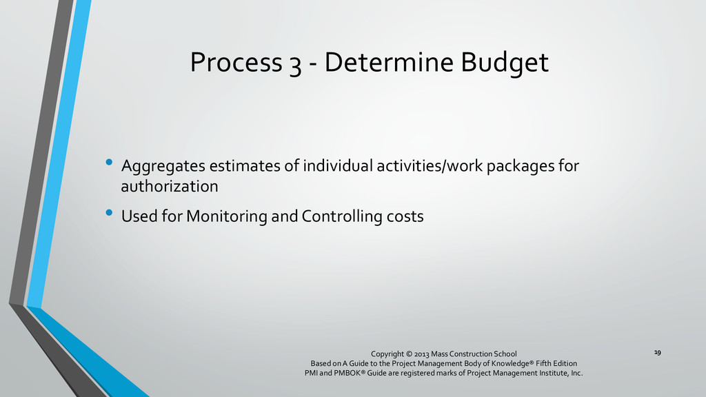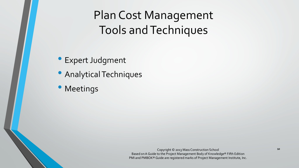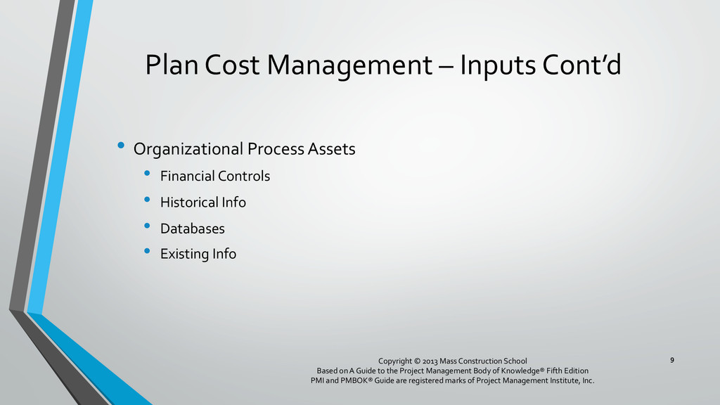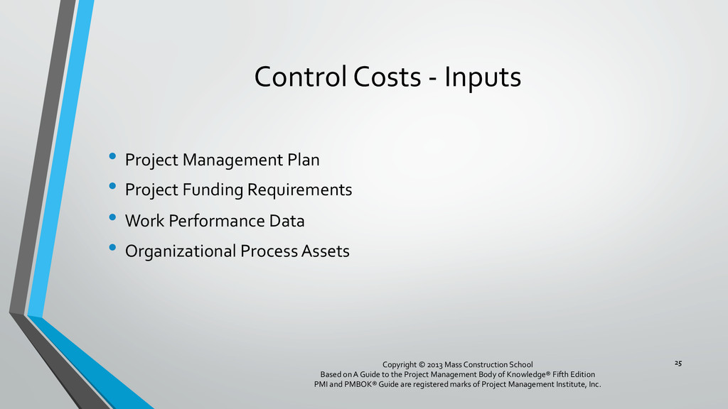 procedures, and documentation for planning, managing, expending, and controlling project costs. • Could be done by a single person on small projects • Early scope definition allows greater influence on cost for entire project • In some organizations done outside project. In others, within project. 6 Copyright © 2013 Mass Construction School Based on A Guide to the Project Management Body of Knowledge® Fifth Edition PMI and PMBOK® Guide are registered marks of Project Management Institute, Inc.