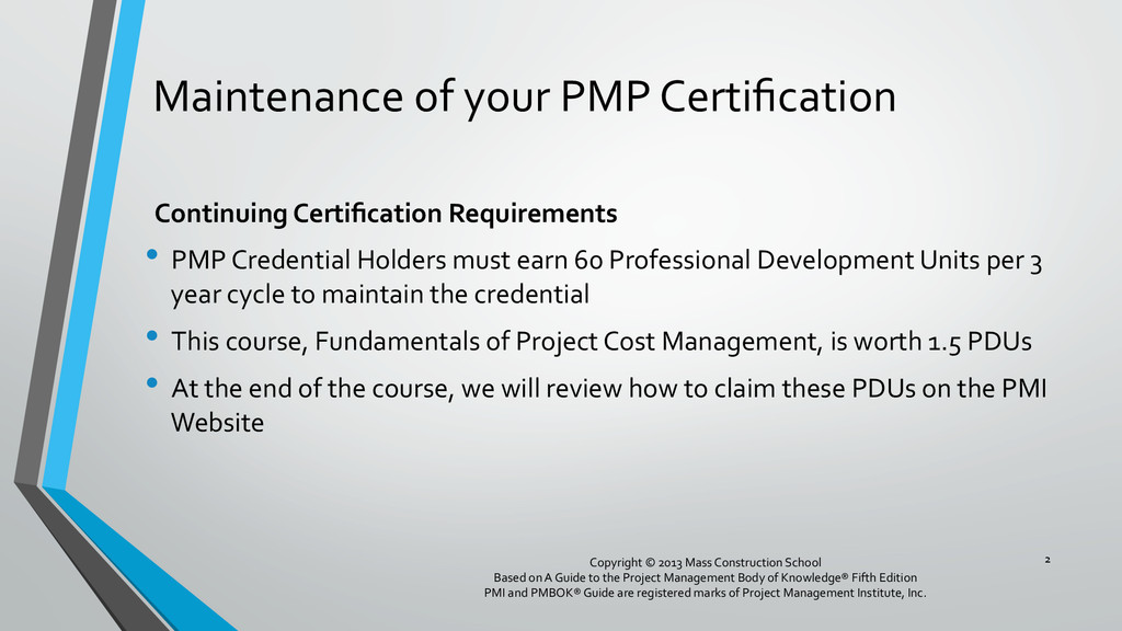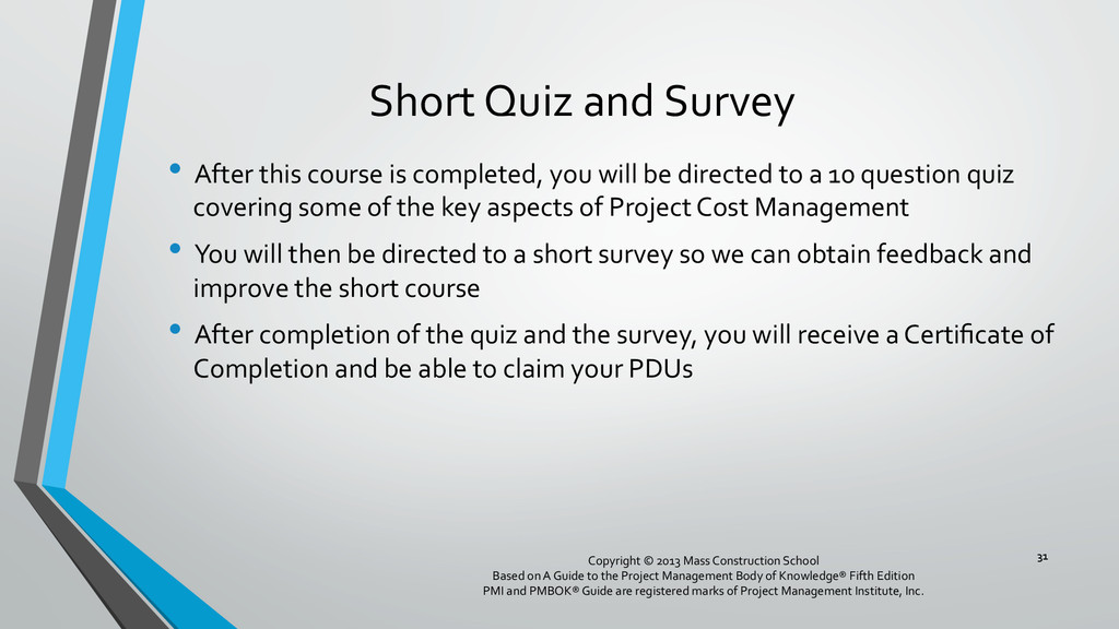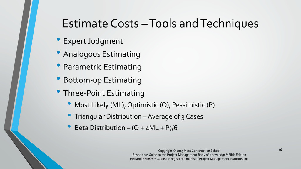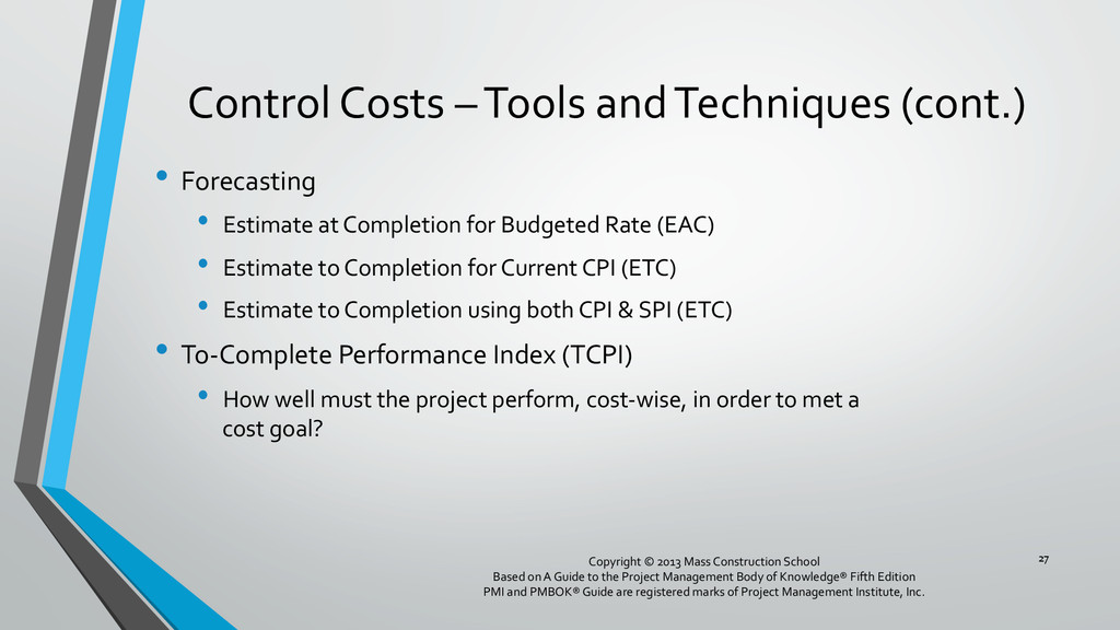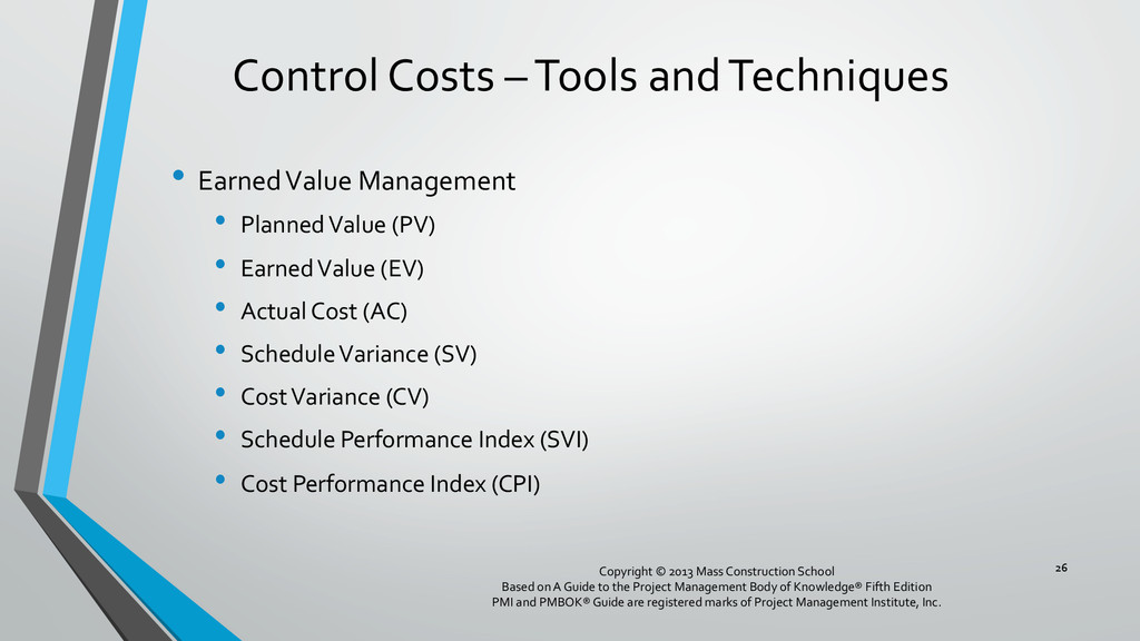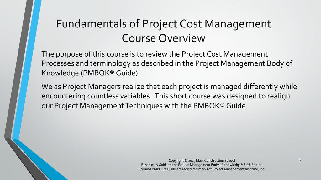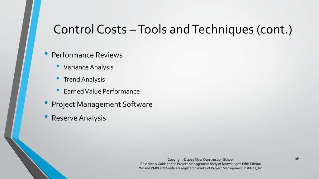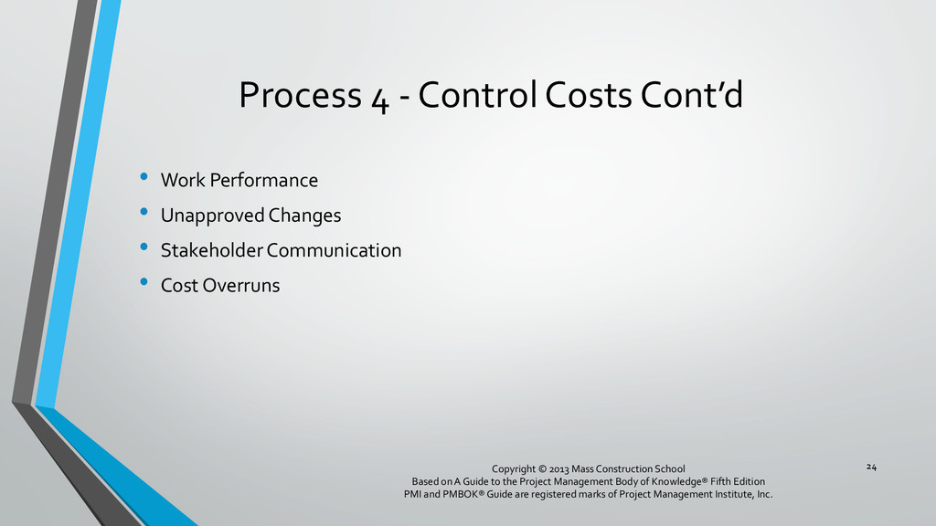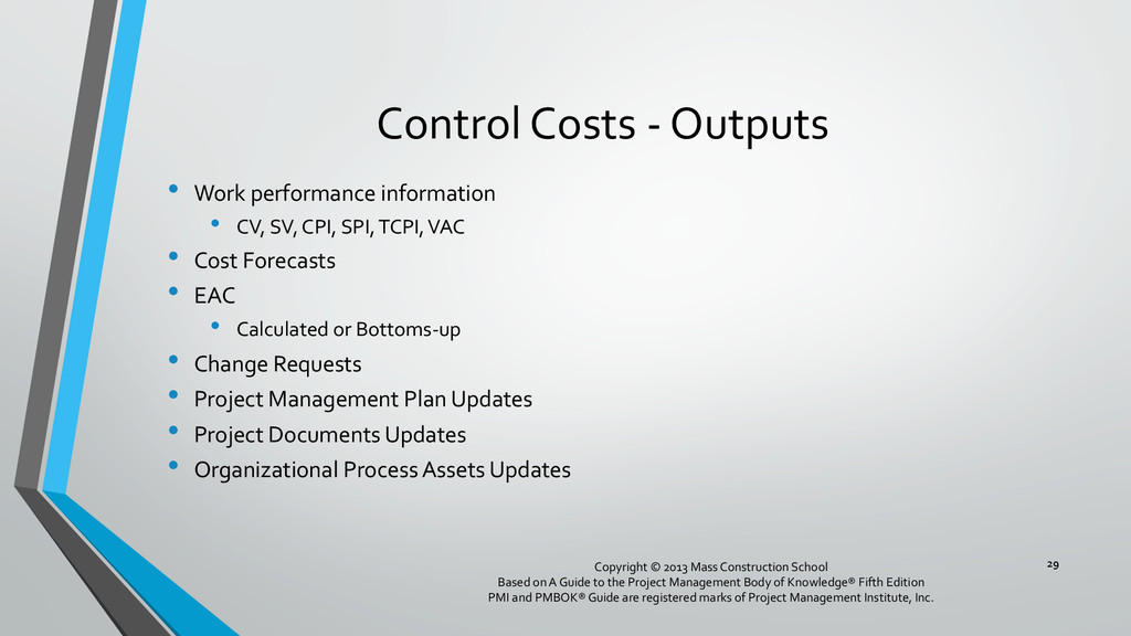 procedures, and documentation for planning, managing, expending, and controlling project costs. • Could be done by a single person on small projects • Early scope definition allows greater influence on cost for entire project • In some organizations done outside project. In others, within project. 6 Copyright © 2013 Mass Construction School Based on A Guide to the Project Management Body of Knowledge® Fifth Edition PMI and PMBOK® Guide are registered marks of Project Management Institute, Inc.