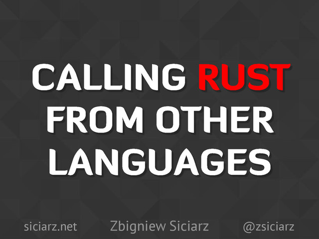 ccall "count_substrings" count_substrings :: CString -> CString -> IO Int main :: IO () main = do value <- newCString "banana" substr <- newCString "na" count_substrings value substr >>= print Zbigniew Siciarz @zsiciarz siciarz.net