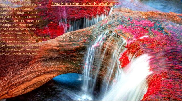 радуга», в большинстве случаев выглядит вполне нормально, но с июля по ноябрь все меняется. В это время Macarenia clavigera, уникальное растение, которое устилает дно реки, становится ярко- красным, чередующимся с голубой водой, зеленым мхом и желтым песком Река Кано-Кристалес, Колумбия