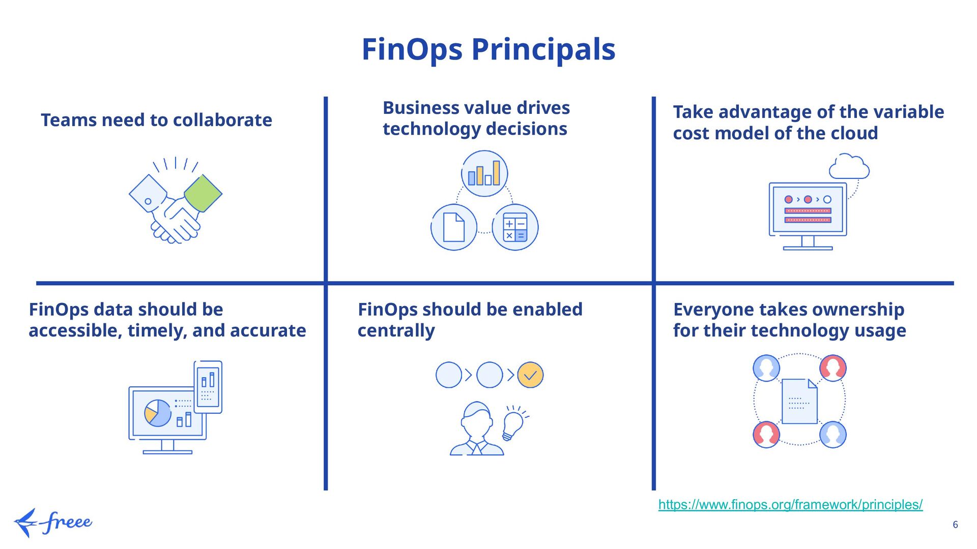 technology decisions FinOps data should be accessible, timely, and accurate FinOps should be enabled centrally Take advantage of the variable cost model of the cloud Everyone takes ownership for their technology usage https://www.finops.org/framework/principles/