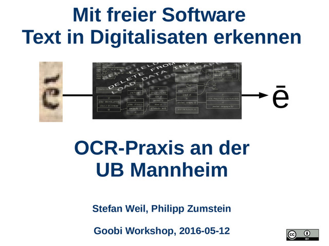 JPEG, JPEG2000, ... • Layouterkennung mit Leptonica • Zeichenbasierte Erkennung durch Mustervergleich • Geplant für 2016: neuronales Netzwerk • Mehr als 100 Sprachen auswählbar • Sprachregeln (Wörterbücher, Silben, ...) werden nur als Hinweise verwendet • Ausgabeformate hOCR, TXT, PDF und Spezialformate • Sehr aktive Entwickler-Community https://github.com/tesseract-ocr • Bestandteil aller großen Linux-Distributionen • Freie Nutzung z. B. für Distributed OCR (Bachelor-Arbeit)