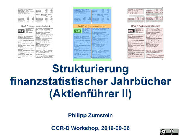 Vorgehen • Spezifische Methoden für die Datenquelle “Aktienführer” • Open Source Entwicklung • Wir freuen uns Teil der OCR-Community DE zu sein! • https://bib.uni-mannheim.de/index.php?id=1471 • https://digi.bib.uni-mannheim.de/aktienfuehrer/ • {baierer, zumstein}@bib.uni-mannheim.de