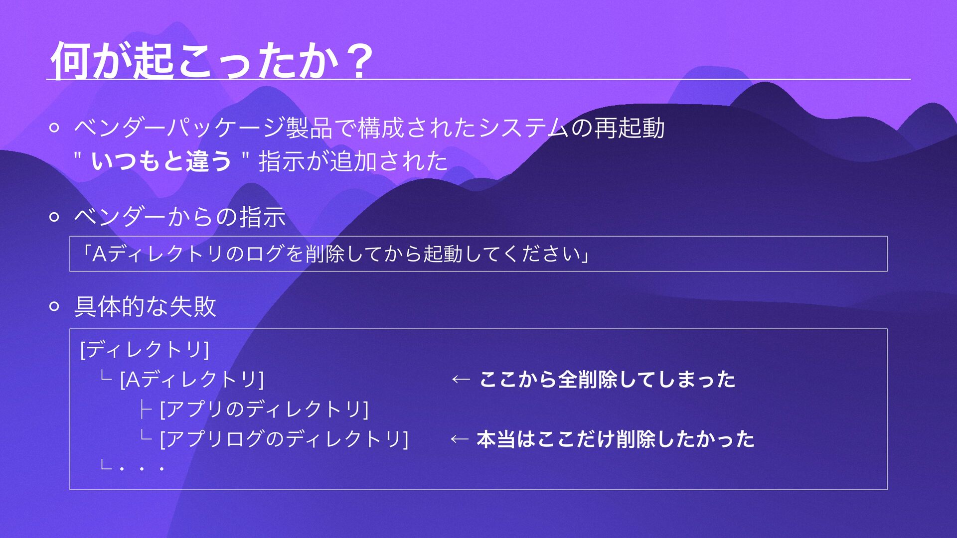 Կ͕ى͔ͬͨ͜ʁ ϕϯμʔύοέʔδͰߏ͞ΕͨγεςϜͷ࠶ىಈ ͍ͭͱҧ͏ࢦ͕ࣔՃ͞Εͨ ϕϯμʔ͔Βͷࢦࣔ ۩ମతͳࣦഊ ʮ"σΟϨΫτϦͷϩάΛআ͔ͯ͠Βىಈ͍ͯͩ͘͠͞ʯ <σΟϨΫτϦ> ɹᵋ<"σΟϨΫτϦ>ɹɹɹɹɹɹɹɹɹˡ͔͜͜Βશআͯ͠͠·ͬͨ ɹɹɹᵓ<ΞϓϦͷσΟϨΫτϦ> ɹɹɹᵋ<ΞϓϦϩάͷσΟϨΫτϦ>ɹɹˡຊ͚ͩ͜͜আ͔ͨͬͨ͠