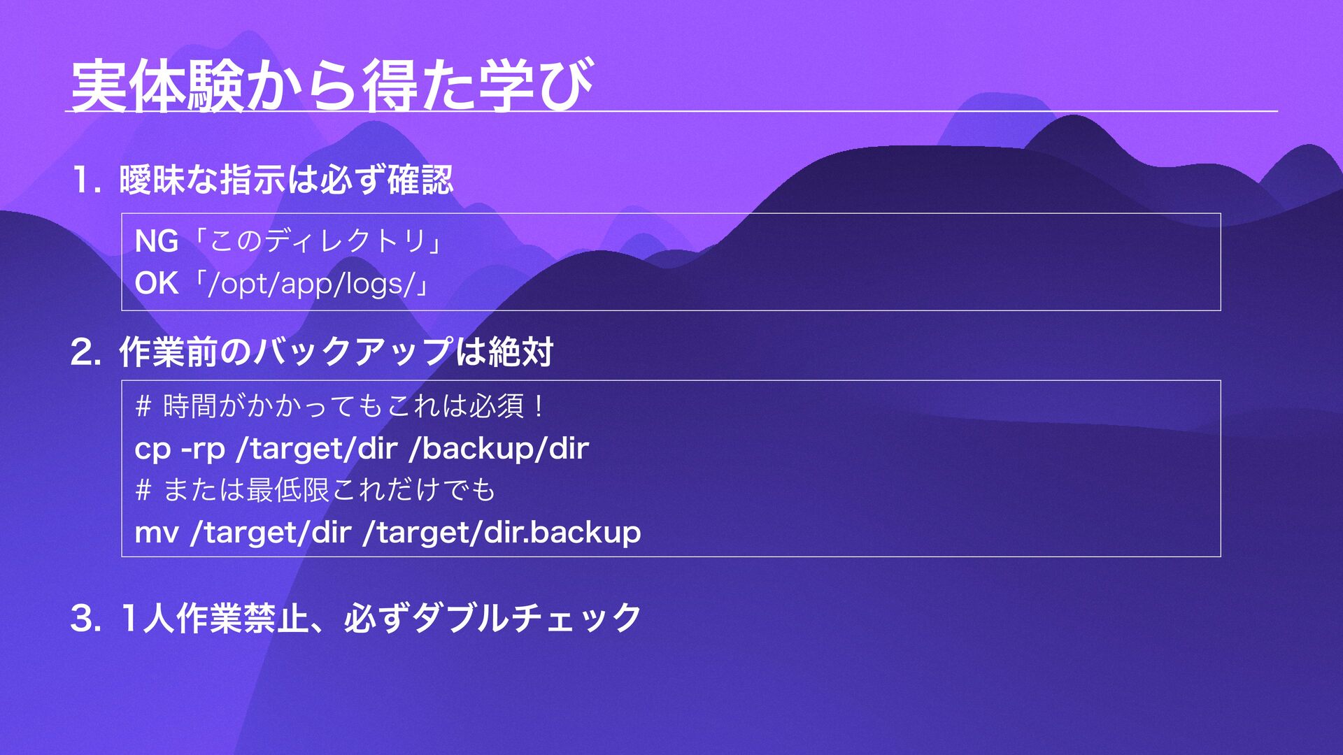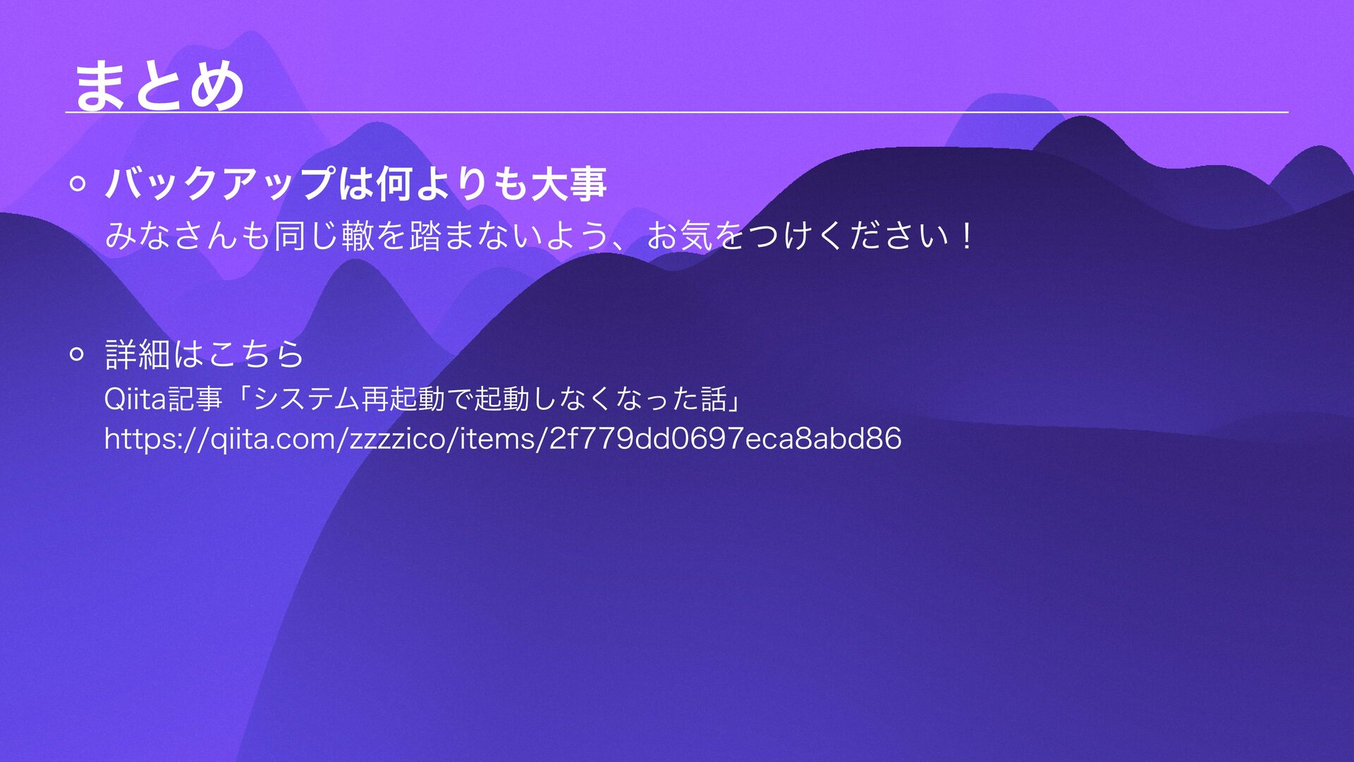 ͷ࿈ <>ϩά͚ͩͰͳ͘ɺΞϓϦআͯ͠͠·ͬͨ <>ΞϓϦ͕ॱ൪ʹىಈ͠ͳ͍ͷͰɺγεςϜͦͷͷ͕ىಈ͠ͳ͘ͳͬͨ <>όοΫΞοϓ͔Β෮چ͠Α͏ͱࢼΈΔ͕ʜ ɹɹ࡞ۀ࣌ɺ࣌ؒͷলུͷͨΊɺόοΫΞοϓΛऔಘ͍ͯ͠ͳ͔ͬͨ <>ϕϯμʔʹॿ͚ΛٻΊΔ͕ʜ ɹɹि࡞ۀͰϕϯμʔͱۓٸ࿈བྷ͕͔ͭͳ͔ͬͨ ➡︎ حతʹγεςϜߏங࣌ͷόοΫΞοϓΛൃݟʂ ɹͦͷόοΫΞοϓ͔Β෮چ͠ɺແࣄʹγεςϜىಈͰ͖ͨ
